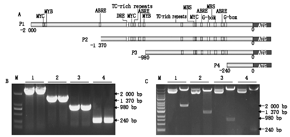 Kim J S, Mizoi J, Yoshida T, Fujita Y, Nakajima J, Ohori T, Todaka D, Nakashima K, Hirayama T, Shinozaki K, Yamaguchi-Shinozaki K. An ABRE promoter sequence is involved in osmotic stress-responsive expression of the DREB2A gene,which encodes a transcription factor regulating drought-inducible genes in Arabidopsis[J]. Plant and Cell Physiology, 2011, 52(12):2136-2146. doi: 10.1093/pcp/pcr143.