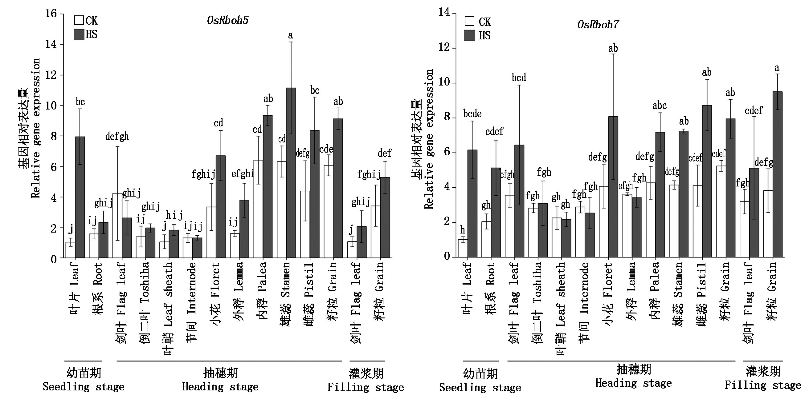 不同生育期高温胁迫下水稻OsRboh家族基因的表达模式