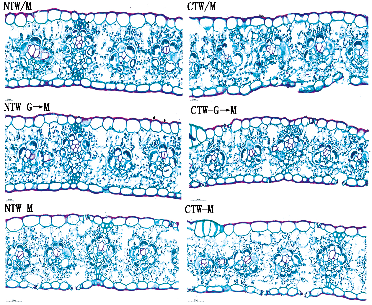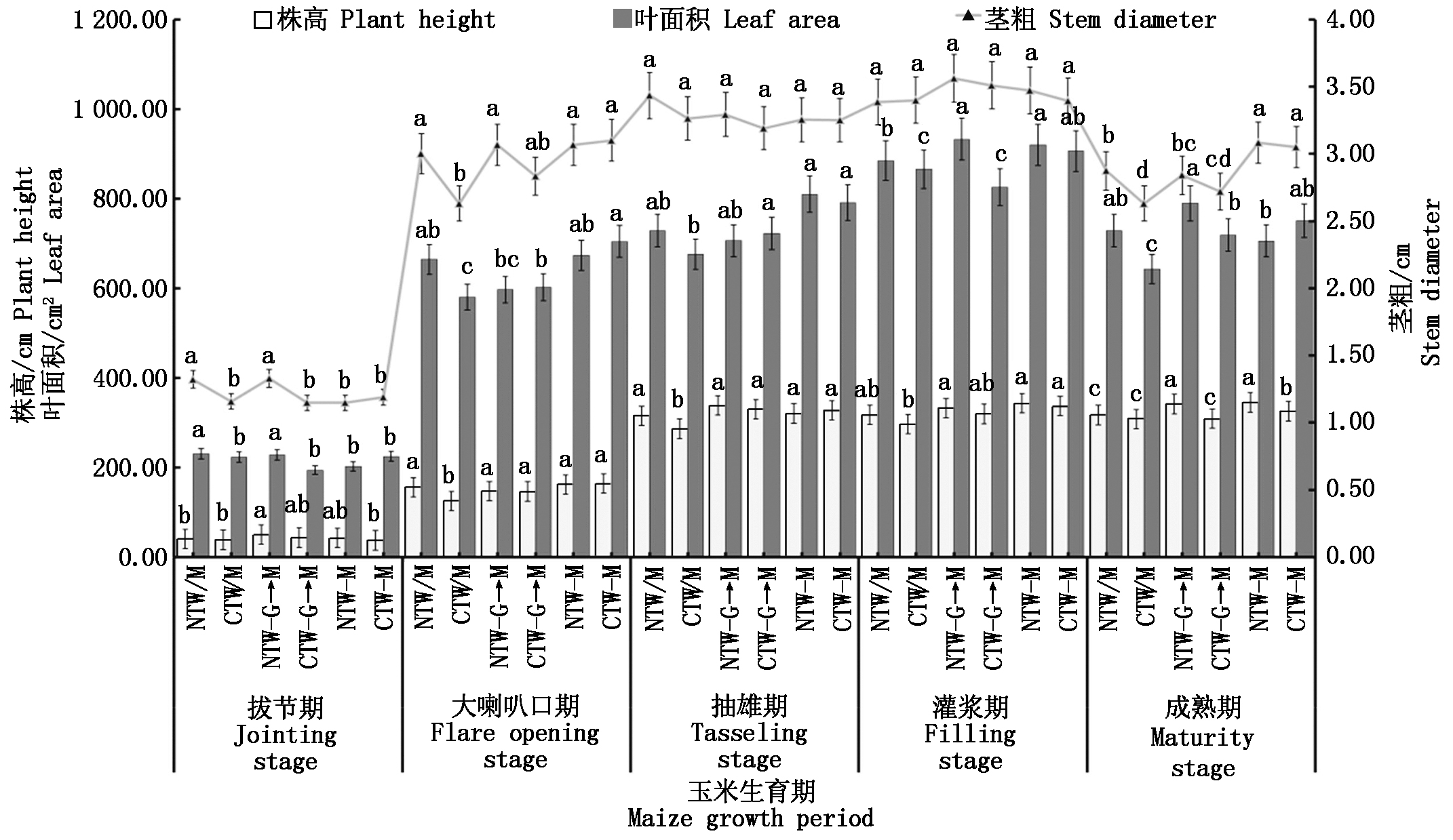 探究不同农作模式对玉米生长发育、光合作用、叶片结构及产量的影响,为优化河西绿洲灌区耕作栽培措施和创建玉米高效种植模式提供理论依据。试验设置免耕(NT)与传统翻耕(CT)2种耕作方式,小麦玉米间作(W/M)、麦后插播冬油菜玉米轮作(W-G→M)、小麦玉米轮作(W-M)3种种植模式,共6个处理。结果表明,与CT相比,NT玉米株高、茎粗和叶面积分别增加6.83%,4.10%,3.97%,间作玉米干物质量高于轮作但差异不显著;叶片色素随生育期呈先增后减的趋势,表现为NT叶绿素a、b与类胡萝卜素较CT分别高11.93%,22.41%,13.43%,且差异显著;NT叶片净光合速率(Pn)与胞间CO2浓度(Ci)较CT分别高9.17%,3.81%,CT处理气孔导度(Gs)和蒸腾速率(Tr)较NT分别高9.95%,1.48%;NT玉米叶片结构较优,叶肉细胞多且排列有序,维管束清晰可见,花环结构较大,栅栏组织与海绵组织丰富,NT叶片较CT厚2.51%,且差异显著;NT玉米较CT增产8.02%,间作产量收益大于轮作(LER>1)。研究发现,免耕玉米生长发育、叶片结构及产量均优于传统耕作,间作比轮作更有利于增产,故可将免耕小麦间作玉米作为该区主要的农作模式进行推广。