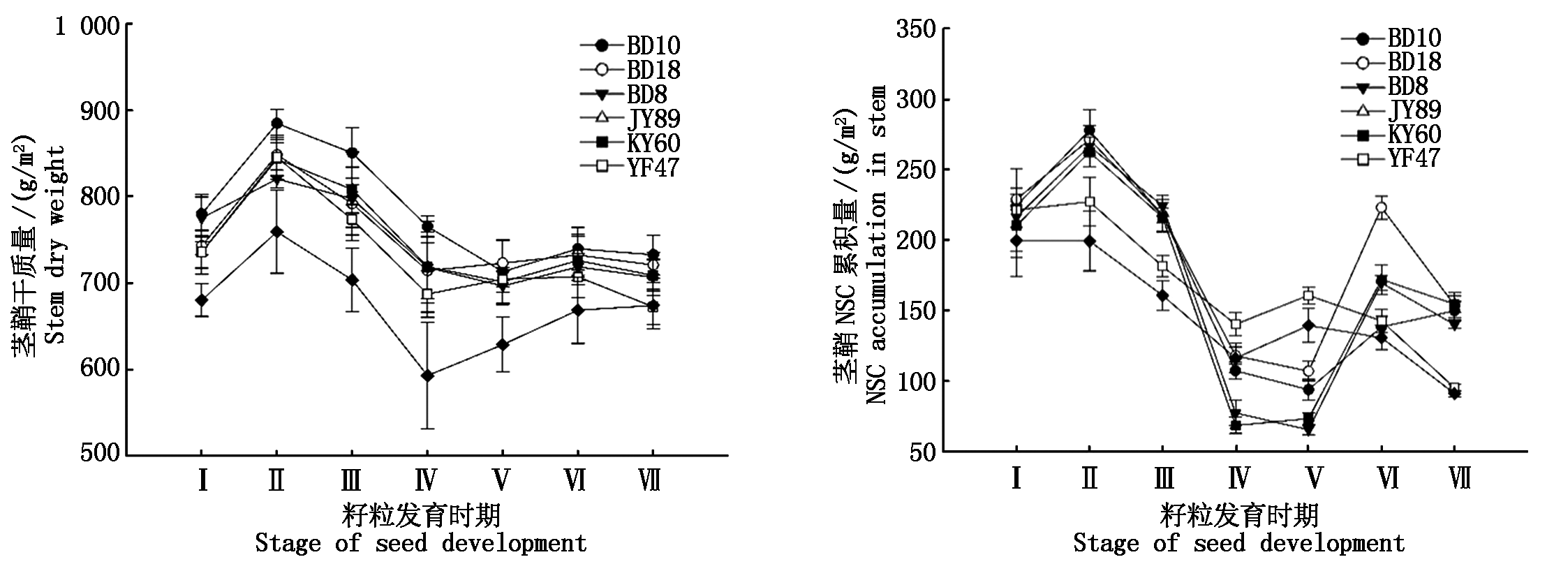 滨稻8号、滨稻10号和滨稻18是河北省农林科学院滨海农业研究所最新选育的耐逆高产系列水稻新品种,均展现弯穗大粒叶下禾的株型特征,在高产栽培条件下产量均超12.5 t/hm2。以滨稻8号、滨稻10号、滨稻18为材料,与其亲本津原89、垦育60及对照盐丰47比较,分析产量构成、干物质积累及光合特性,解析其高产形成机理。结果表明:滨稻品种平均产量12.61~13.06 t/hm2,平均较对照(盐丰47)增产15.51%,地上干物质积累量19.74~20.56 t/hm2,显著高于对照16.45%;产量库容较双亲及对照提升14.5%~15.2%,综合父本多穗与母本大粒特性,千粒质量28~30 g,较对照高16.57%。抽穗后滨稻品种叶面积指数“稳升缓降”,光合势356.83~378.58 (m2·d)/m2,较盐丰47高50.17%,蜡熟期总叶绿素含量高49.42%,净同化率2.62~2.78 g/(m2·d),保障生育后期物质生产。茎鞘非结构性碳水化合物表观转移率39.26%~43.24%,灌浆前中期高效输出充实库容,结实率超93%。综上,滨稻品种通过“大库容+强源供应+流畅转运”协同实现超高产,为华北粳稻高产育种提供理论支撑。