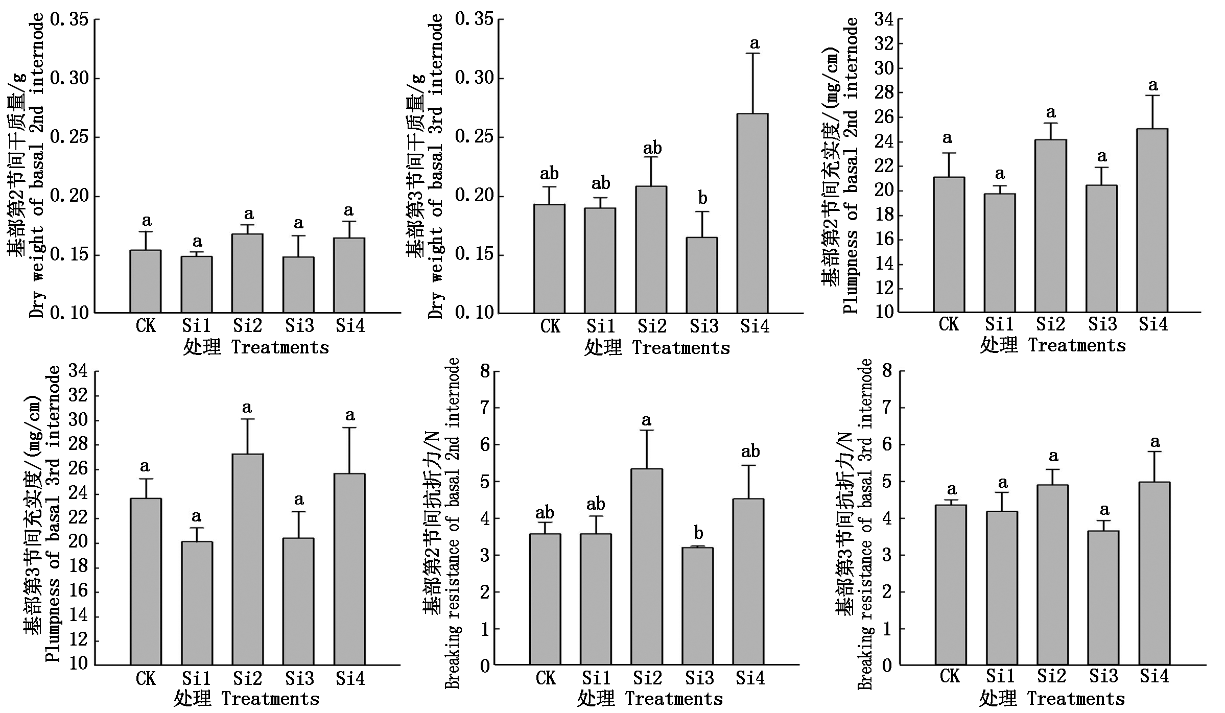 为探究外源硅肥对小麦抗倒性、生长、产量及品质的影响,以垦麦58为试验材料,设置4个硅肥处理:基施硅肥15 kg/hm2(Si1)和30 kg/hm2(Si2)、拔节期追施硅肥15 kg/hm2(Si3)和30 kg/hm2(Si4),以不施硅肥为对照。测定了灌浆期小麦茎秆抗倒伏能力、植株生长、产量及品质相关指标。结果表明,Si4处理显著降低小麦株高、重心高度和基部第2节间长度;Si3处理基部第2,3节间厚度增加14.7%以上;Si2和Si4处理的基部第2,3节间充实度增加8.6%~18.7%,抗折力提高12.4%~49.2%,但对节间粗度和干质量影响较小。外源硅肥提高了拔节期叶绿素含量(SPAD),对分蘖、成穗、地上部干物质积累、收获指数、产量及主要品质指标无显著影响。综上,外源硅肥通过降低株高、重心高度和基部节间长度,增加基部节间厚度、充实度和抗折力,改善了茎秆质量,增强了茎秆抗倒性,同时提高了叶绿素含量,对小麦生长、产量和品质无不利影响。硅肥基施或拔节期追施均可。