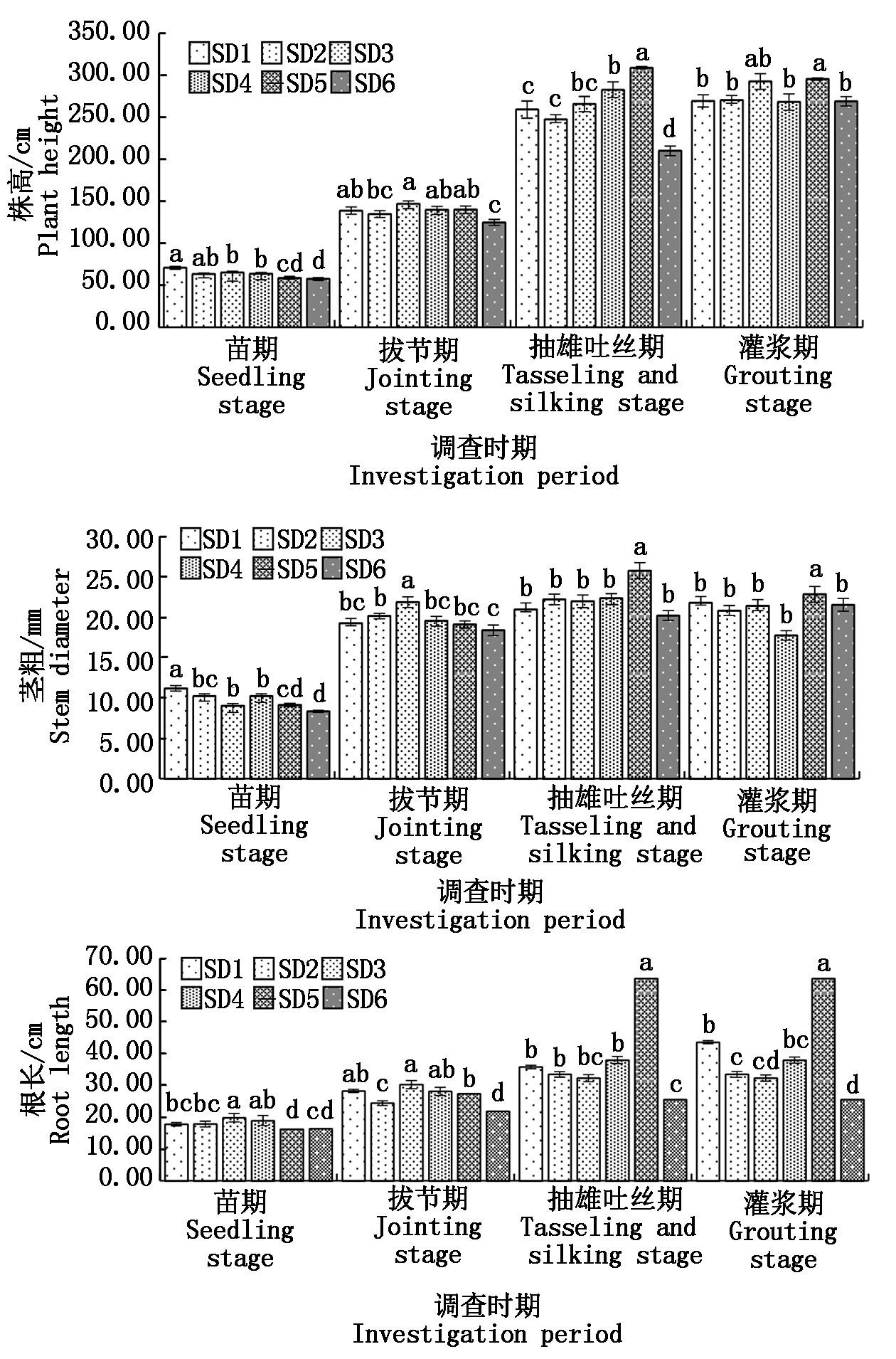 鉴于松嫩平原西部半干旱区黑土地退化严重、部分地区春季无法按时播种等背景条件下,为明确春播期土壤相关性状与玉米生长发育的作用机制,阐明针对不同土壤特性下作物适时播种的适应性规律,加强东北黑土区土壤冻融循环探究应用,以及为本气候区作物适时春播提供切实有效的理论依据和实践参考。基于黑龙江省农业科学院克山分院土壤质量长期定位监测试验地,在中厚黑土生态区冻融交替条件下,通过开展春播期不同地形地貌土壤水热状况监测以及作物播种适应性评价研究,采用大田试验,设置不同春播播期处理:SD1(4月15日)、SD2(4月20日)、SD3(4月25日)、SD4(4月30日)、SD5(5月5日)和SD6(5月10日),进行不同春播处理土壤水热性状监测及春玉米生长发育与产量形成研究分析。随着春播播期推迟,外界气温逐渐升高,伴随降雨出现,空气湿度、耕层土壤温湿度逐渐增加,土壤容重降低,水稳性团聚体占比减小,小粒级土壤颗粒占比呈上升趋势。基于不同土壤水热性状条件下,玉米抽雄期-籽粒灌浆期SD5播期处理玉米植株株高、基部节间茎粗和根系长度均显著优于其他播期处理;同时在不同生育期玉米叶片SPAD值和叶片氮含量方面也表现较优。在玉米果穗穗部性状和产量表现方面,SD4处理果穗穗行数、穗粗和籽粒粒深表现较优;同时产量最大值为13 545.23 kg/hm2,较其余处理显著增加12.58%~56.21%。基于松嫩平原西北部中厚黑土区农田生态气候实际条件以及土壤水热性状背景,春玉米适时早播可以合理利用外界光热水资源,促进植株生长发育,优化植株干物质积累,从而实现早收、抢收,达到高产稳产效果。