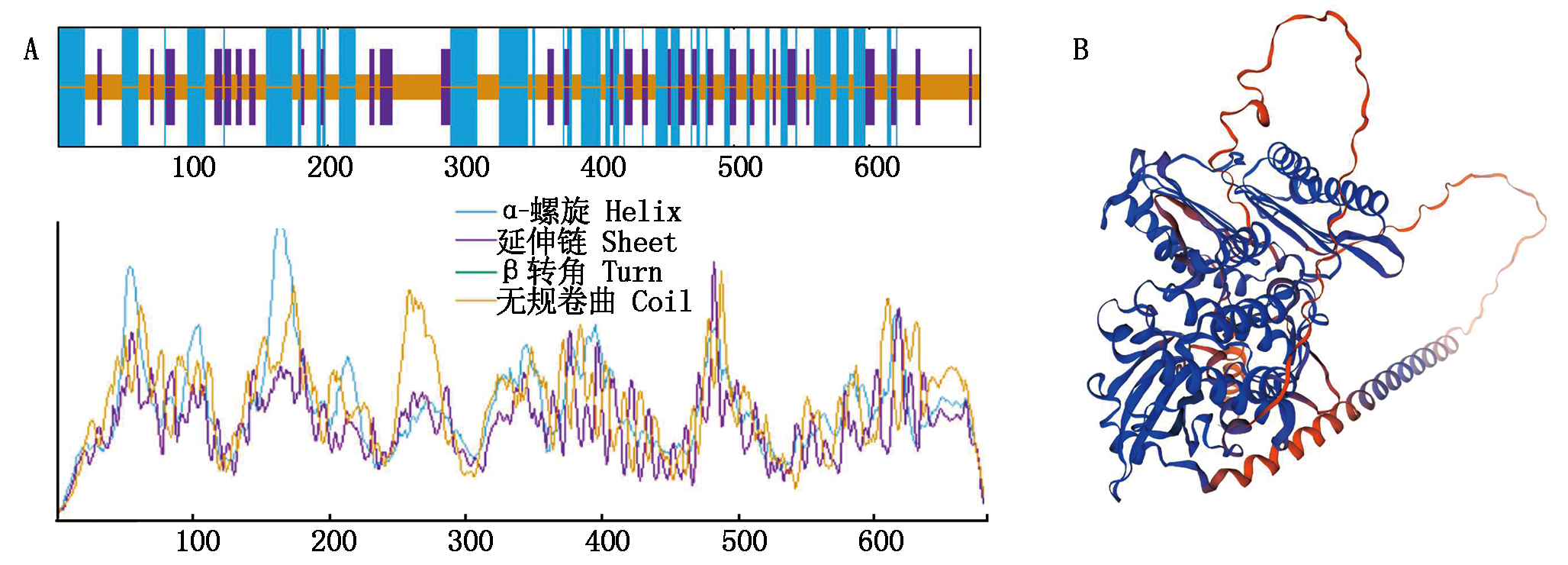 探究桑桑牦牛核糖体蛋白L8基因(RPL8)的结构与理化指标,并通过qPCR技术测定牦牛各组织中RPL8基因的表达水平,旨在为深入探讨RPL8基因在牦牛体内的生物学功能奠定坚实的理论基础。以桑桑牦牛肾脏组织cDNA为模板克隆桑桑牦牛RPL8基因编码区序列(CDS ),对CDS区序列进行生信分析,并使用RT-qPCR检测RPL8基因在桑桑牦牛各组织中的相对表达水平。桑桑牦牛RPL8基因的CDS区全长456 bp,共编码151个氨基酸;同源性比对发现桑桑牦牛与家牛的同源性最高,与美洲熊亲缘关系最远;蛋白分析显示,RPL8蛋白内共有潜在磷酸化位点18个,分子质量16.293 89 ku,原子总数2 325,氨基酸等电点为10.90,不稳定系数为41.81,总平均疏水性为-0.687,预测为不稳定亲水性蛋白质,无跨膜结构域和信号肽区域。亚细胞定位显示,RPL8蛋白主要位于细胞核中(65.20%)。RPL8蛋白高级结构由无规则卷曲(49.01%)、延伸链(27.15%)、β-转角(13.91%)和α-螺旋(9.93%)相互连接而成。RT-qPCR结果显示,桑桑牦牛8个组织中均有RPL8基因的表达,在牦牛心脏、肝脏、十二指肠脏组织中表达最高,与其他组织表达差异显著。