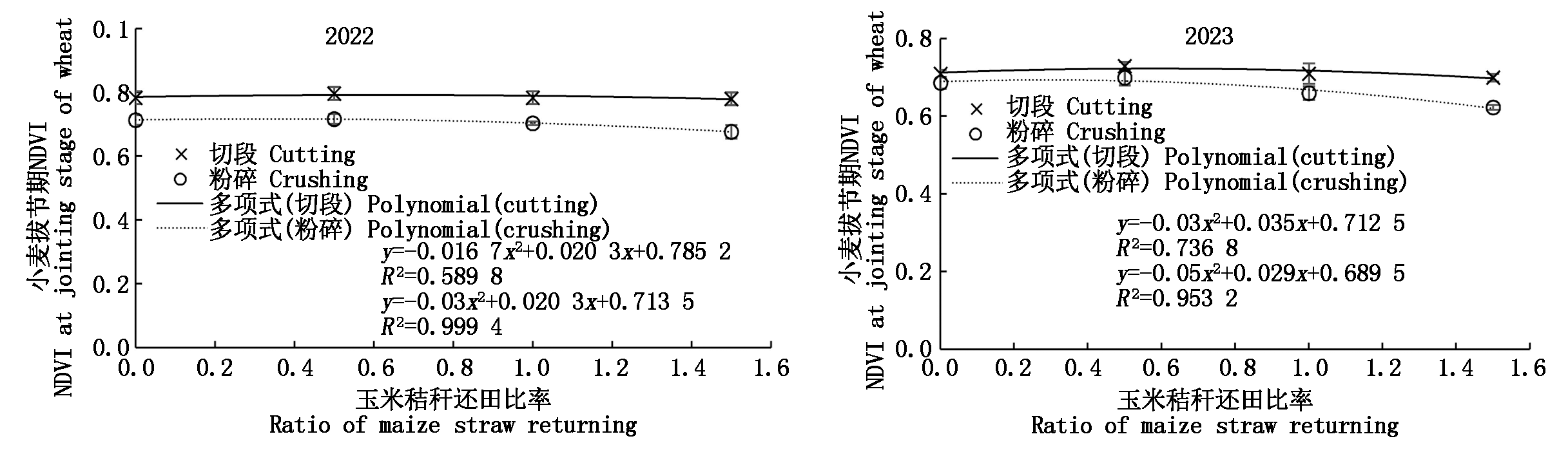 旨在研究华北地区小麦玉米轮作体系下,玉米秸秆还田在培肥地力、提高产能方面的作用,探寻秸秆最佳还田方式和适宜还田量。2021—2023年,在河北省曲周县,通过田间裂区试验,对比了玉米秸秆不同还田方式及用量对小麦生长发育、产量构成及土壤有机质含量的影响。主区设2个处理,分别为秸秆切段还田和秸秆粉碎还田;副区为秸秆还田量,4个水平,分别为当年玉米秸秆量的0,0.5,1.0,1.5倍。研究表明:与秸秆粉碎还田相比,2023年玉米秸秆切段还田小麦产量提高4.3%,穗数提高7.6%,收获指数提高1.4%,均达显著水平;小麦秸秆N含量高0.04百分点,差异显著;小麦地上部N、P吸收量分别显著提高10.8%,14.3%(2022年),但秸秆切段还田显著降低了小麦秸秆K含量,降低0.13百分点(2023年);切段还田能够明显促进小麦越冬前后生长,拔节期NDVI值提高11.9%(2022年);土壤pH值增加0.22个单位(2023年)。随着秸秆还田量的增加,小麦产量和拔节期NDVI值呈现先升后降的趋势,地上部小麦N、P、K吸收量呈现显著下降趋势,土壤有机质呈现持续显著增加趋势。综合小麦生长势和产量,秸秆切段处理适宜还田比例为58%~62%,粉碎处理适宜还田比率为29%~42%。在设置试验条件下,玉米秸秆切段还田在促进小麦生长、提高小麦产量等方面有明显优势;将58%~62%的玉米秸秆进行切段还田,可在小麦玉米轮作区域推广应用。