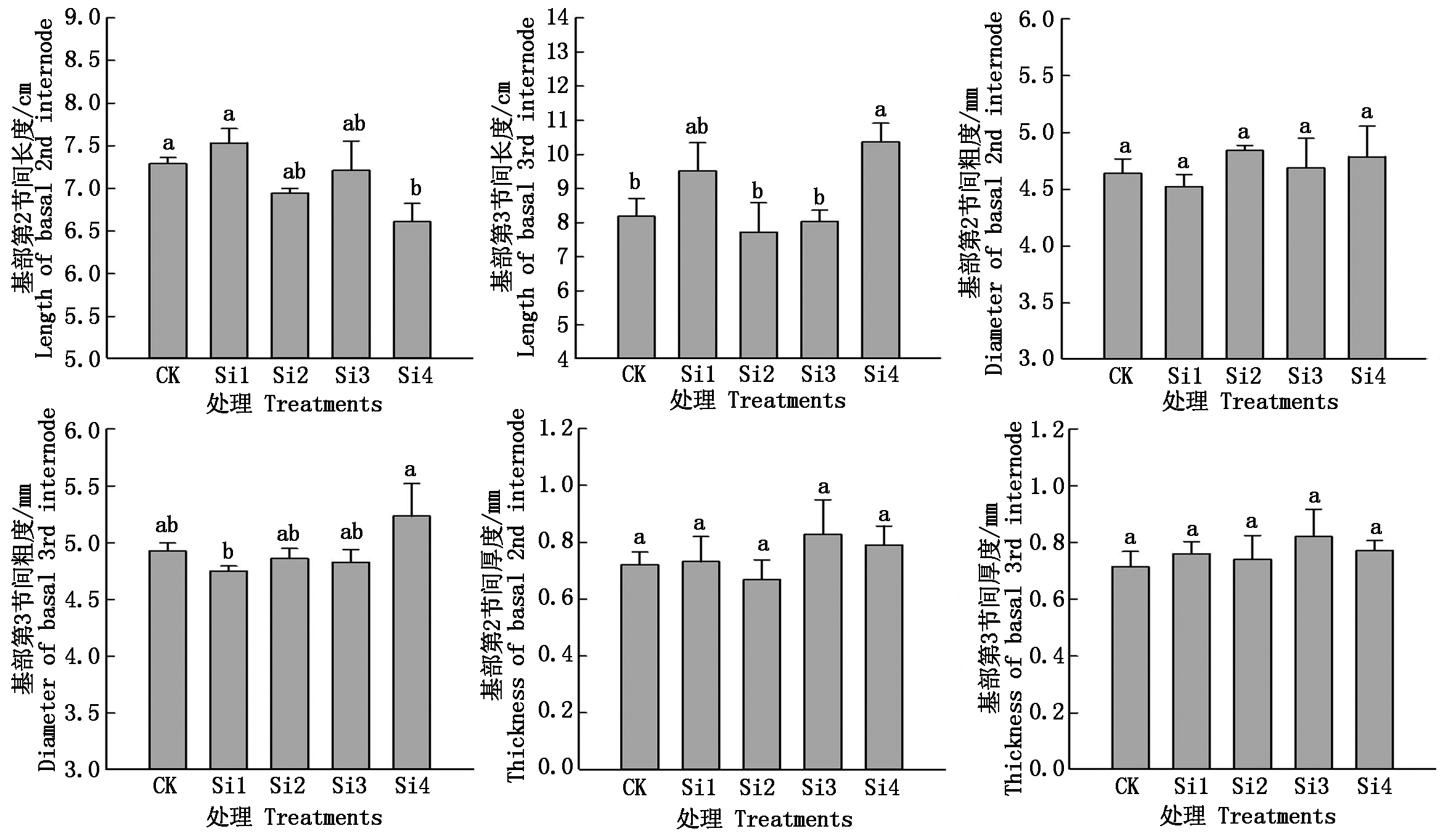 为探究外源硅肥对小麦抗倒性、生长、产量及品质的影响,以垦麦58为试验材料,设置4个硅肥处理:基施硅肥15 kg/hm2(Si1)和30 kg/hm2(Si2)、拔节期追施硅肥15 kg/hm2(Si3)和30 kg/hm2(Si4),以不施硅肥为对照。测定了灌浆期小麦茎秆抗倒伏能力、植株生长、产量及品质相关指标。结果表明,Si4处理显著降低小麦株高、重心高度和基部第2节间长度;Si3处理基部第2,3节间厚度增加14.7%以上;Si2和Si4处理的基部第2,3节间充实度增加8.6%~18.7%,抗折力提高12.4%~49.2%,但对节间粗度和干质量影响较小。外源硅肥提高了拔节期叶绿素含量(SPAD),对分蘖、成穗、地上部干物质积累、收获指数、产量及主要品质指标无显著影响。综上,外源硅肥通过降低株高、重心高度和基部节间长度,增加基部节间厚度、充实度和抗折力,改善了茎秆质量,增强了茎秆抗倒性,同时提高了叶绿素含量,对小麦生长、产量和品质无不利影响。硅肥基施或拔节期追施均可。