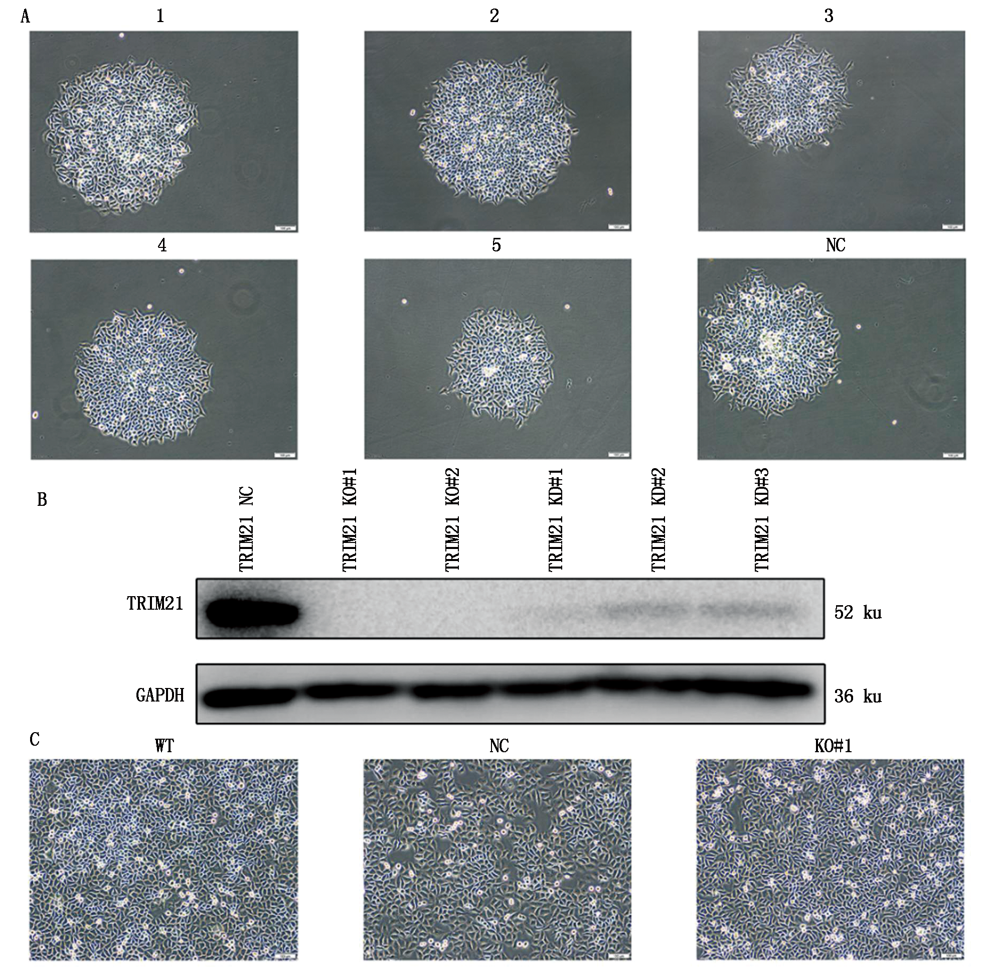 旨在利用CRISPR/Cas9基因编辑技术,成功构建TRIM21基因敲除的稳定人宫颈癌细胞(HeLa)系。首先,针对TRIM21基因设计并合成了2个特异性的sgRNA(sgRNA1和sgRNA2),通过PCR扩增和无缝克隆技术将其分别克隆至LentiCRISPRv2载体中。随后,利用电转染法将编辑载体转染至HeLa细胞中,并通过嘌呤霉素筛选获得成功整合编辑载体的单克隆细胞系。经Western Blot验证和扩大培养,获得了稳定敲除TRIM21的HeLa细胞系。基于该细胞系,进一步探究了TRIM21在调控Ⅰ型干扰素信号通路中的作用。试验结果表明,TRIM21敲除显著抑制了细胞内MDA5、MAVS和IRF3的表达水平,同时抑制了IRF3的磷酸化,揭示了TRIM21在Ⅰ型干扰素信号通路中的重要调控作用。成功构建的TRIM21敲除HeLa细胞系为深入研究TRIM21调控病毒增殖机制及其在先天免疫应答中的作用提供了可靠的细胞模型;通过优化试验方法,证实了电转染法在构建基因敲除细胞系中的高效性和稳定性,为其他基因敲除细胞系的构建提供了技术参考。