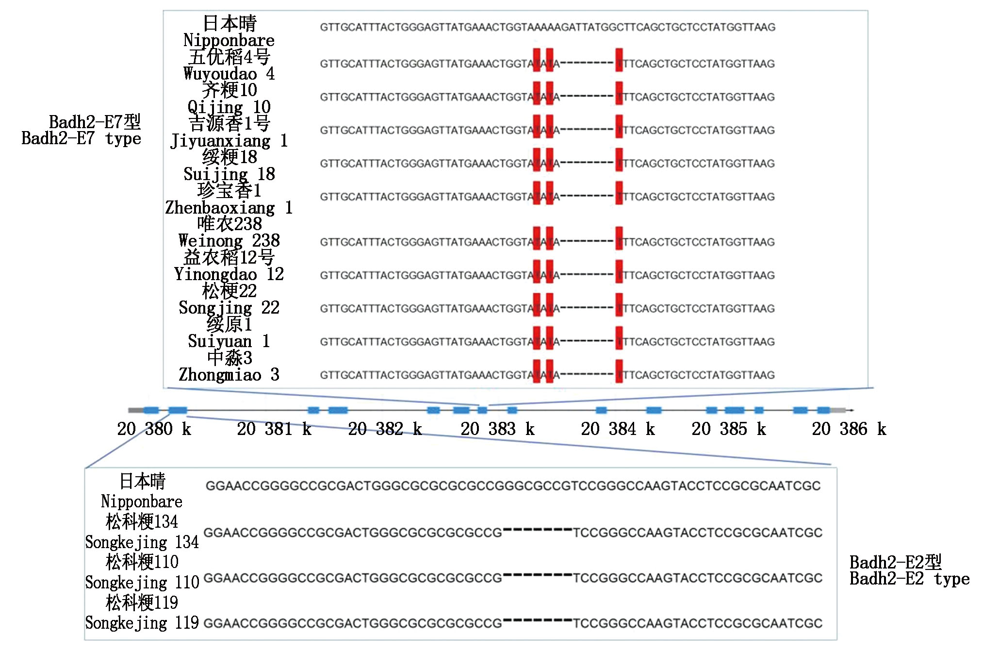 香稻种质资源的筛选和香味基因的快速鉴定与利用对香稻遗传育种具有重要意义。为了明确黑龙江省香稻材料的香味类型,提高香稻品种的育种效率,通过对黑龙江省审定推广的180个香稻品种的Badh2基因进行了测序,测序结果共分为2种突变类型,第一种类型为第7外显子8 bp缺失和3处碱基替换(Badh2-E7型),包含177个品种;第二种类型为第2外显子7 bp缺失(Badh2-E2型),仅包含3个品种。针对这2个突变类型设计了2个特异性KASP分子标记,通过180份香稻品种鉴定,分型结果与测序结果一致,同时分别利用五优稻4号(Badh2-E7型香稻)/唯农101(普通粳稻)、松科粳134(Badh2-E2型香稻)/东富114(普通粳稻)杂交构建的2个F2群体进行了香味基因筛选鉴定,鉴定结果吻合率为100%,验证了KASP分子标记的准确性。进一步利用KASP标记对实验室自行创制、收集的620份粳稻亲本进行了鉴定,共筛选出248份Badh2-E7型香稻材料,同时对现有的1 220份以E7型香稻为亲本的F7材料进行了分型检测,其中293份材料为香型、906份材料为非香型、21份材料为杂合型;随机抽取香和非香各5份材料进行测序验证,结果验证该KASP分子标记分型正确。为利用分子标记辅助选择方法培育寒地香稻新品种提供了新标记和新材料。