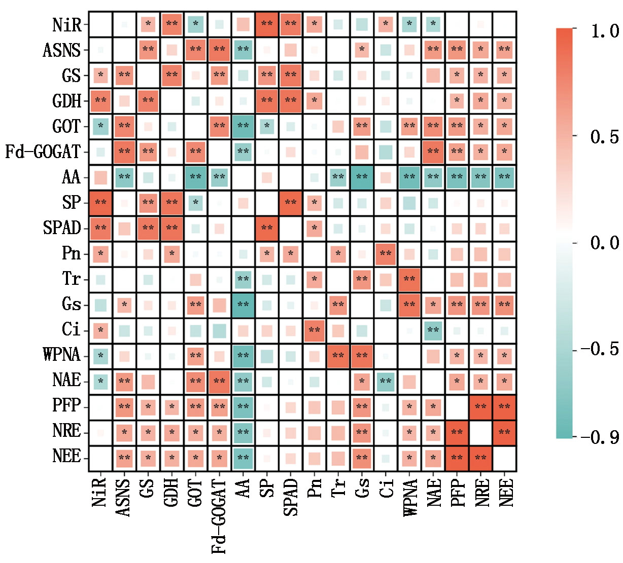 为探讨优化基肥追肥比例结合氮肥用量对烤烟氮代谢和氮素吸收利用的影响,以烤烟品种粤烟97为试验材料,设置常规基追比6∶4+常规氮肥用量(CK)、基追比4∶6+常规氮肥用量(T1)、基追比4∶6+氮肥减量10%(T2)、基追比4∶6+氮肥减量20%(T3)、基追比4∶6+氮肥减量30%(T4)等5个处理,分析不同基追比结合氮肥用量对烤烟氮代谢、光合特性、干物质积累与氮素吸收、氮肥利用率及氮素平衡的影响。结果表明:基追比优化为4∶6后,谷氨酸脱氢酶(GDH)、谷草转氨酶(AST)、Fd-谷氨酸合成酶(Fd-GOGAT)等氮代谢关键酶活性均高于传统基追比6∶4的处理,结合减氮处理的氮代谢酶活性有所降低,其中减氮10%的T2处理与CK差异不大,但减氮20%~30%的T3、T4处理降低幅度较大,与CK差异显著。基追比优化为4∶6后,烤烟的光合速率、SPAD、干物质和氮素积累都明显增加,尤其是在大田生长后期处理间差异显著。基追比优化为4∶6后,烤烟的氮肥吸收利用效率大幅提高,氮肥农学效率、氮肥偏生产力、氮素当季回收率和氮肥经济利用效率分别比CK增加20.68%,6.89%,4.06,3.78百分点,结合氮肥减量各处理的土壤氮素平衡率比CK分别下降17.04~33.36百分点。综上所述,在南方烟区,将基追肥比例从6∶4优化为4∶6,可以促进烤烟大田中后期氮代谢,改善光合特性,增加物质积累和氮素吸收,提高氮肥利用率,结合肥料减量10%还可减少肥料投入,降低土壤氮素盈余,防范环境风险。