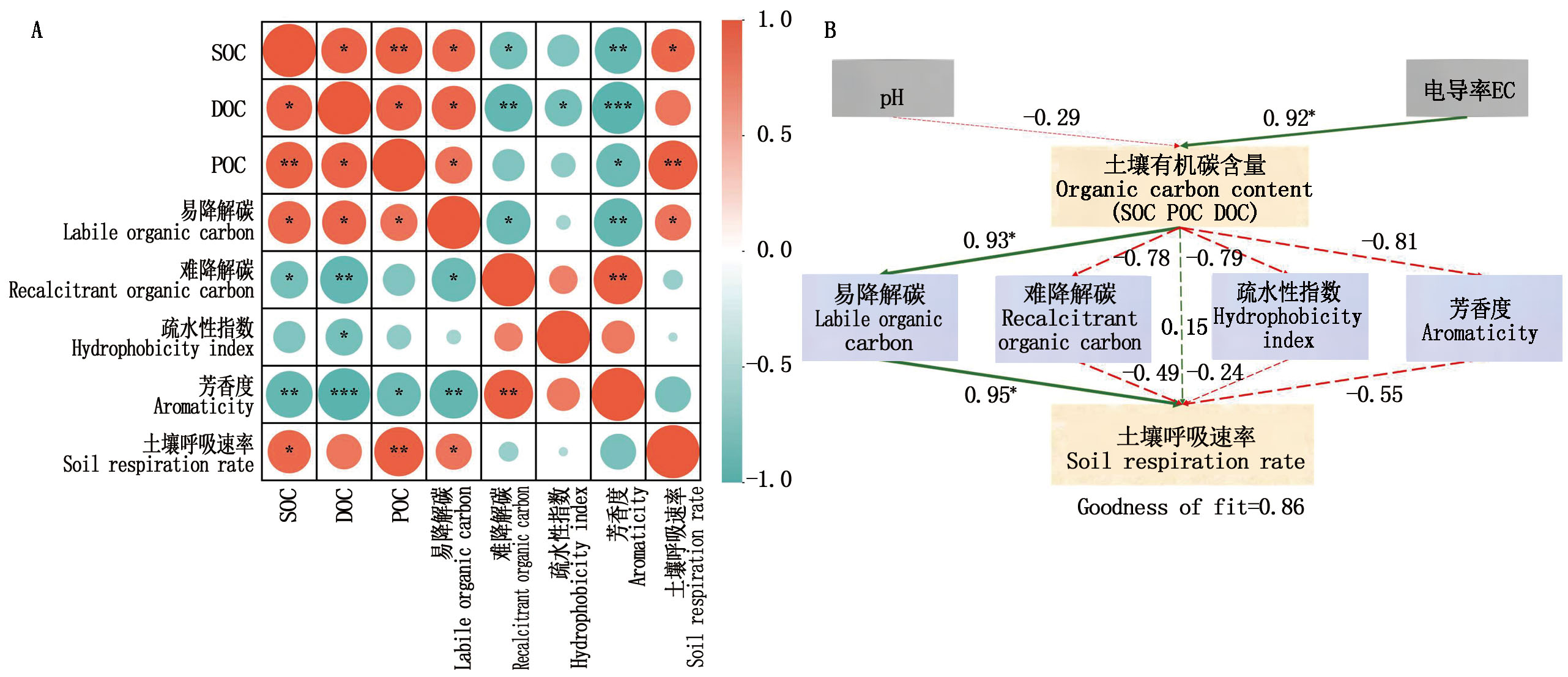 为探究秸秆隔层对盐碱地改良过程中土壤呼吸及有机碳化学结构稳定性的影响,于山东省东营市农高区盐碱地改良试验示范基地设置隔层处理S(35 cm土层处增设5 cm秸秆隔层)和对照处理CK(不设秸秆隔层)2组试验种植苜蓿。通过监测不同处理的土壤呼吸特征,并结合剖面土层土壤pH值、电导率(EC)、有机碳组分含量和化学结构特征进行综合讨论。结果表明:与CK相比,S处理显著提高了苜蓿生长期的土壤呼吸速率,增幅最高可达79.84%;S处理较CK降低了秸秆隔层(35~40 cm)及其上部(0~35 cm)土层的EC,阻导盐分上行;S处理使40~50 cm土层土壤有机碳(SOC)显著增加、颗粒有机碳(POC)和可溶性有机碳(DOC)含量极显著提升,较CK分别提升了16.67%,208.07%,83.41%。40~50 cm土层是土壤有机碳转化的关键土层,对40~50 cm土层土壤有机碳分子结构进行表征发现,S处理较CK降低了DOC中碳的不饱和度(30.60%)和芳香度(4.84%)的加权平均值,降低了DOC中不稳定态碳的占比;S处理增加了POC中烷基碳(10.32百分点)和烷氧碳(8.39百分点)的相对含量,降低了羧基碳(14.24百分点)的相对含量,使POC结构稳定性增强;然而,S处理降低了SOC的烷基碳(3.14百分点)和芳香碳(3.38百分点)占比,增加了烷氧碳(5.17百分点)和羧基碳(1.56百分点)占比,难降解碳比例下降和易降解碳比例上升,使SOC的结构稳定性降低。由相关性分析可知,土壤呼吸的显著增加与关键土层POC和SOC含量分别呈极显著和显著正相关关系,而SOC化学组成中的烷氧碳(易降解碳组分)的增加,使有机碳稳定性降低,是导致土壤呼吸升高的主要原因。综上,增设秸秆隔层在短期内显著提高了土壤呼吸,这与关键土层有机碳化学结构稳定性的降低密切相关,在未来“碳中和”策略下应考虑隔层材料的筛选研究及其长期效应。