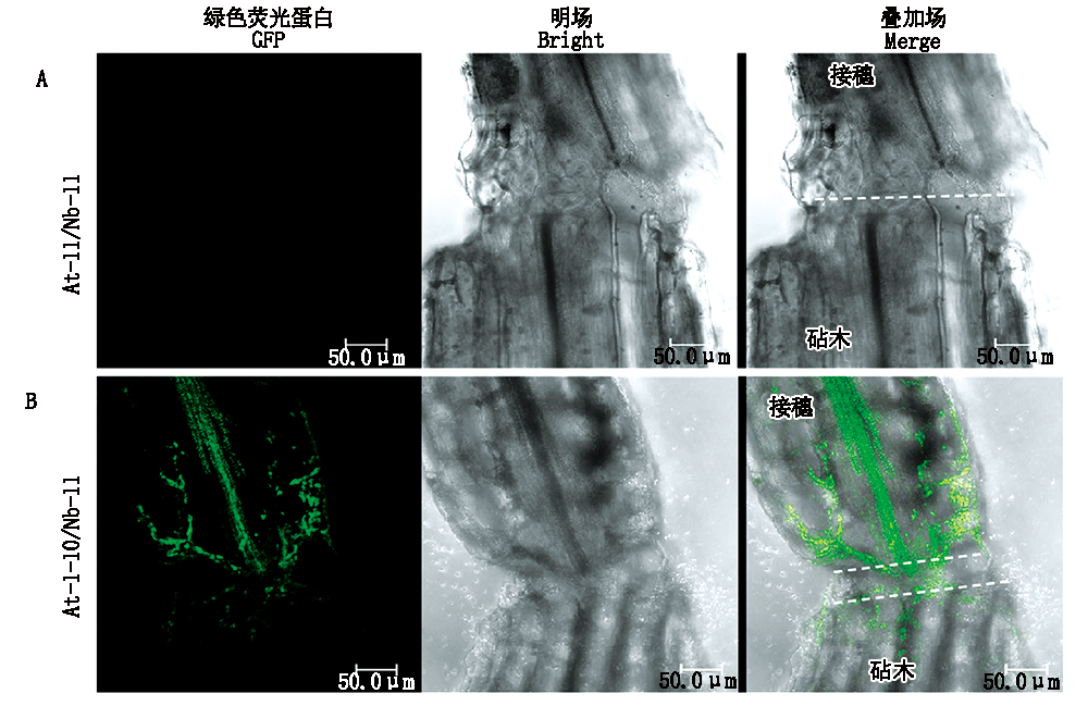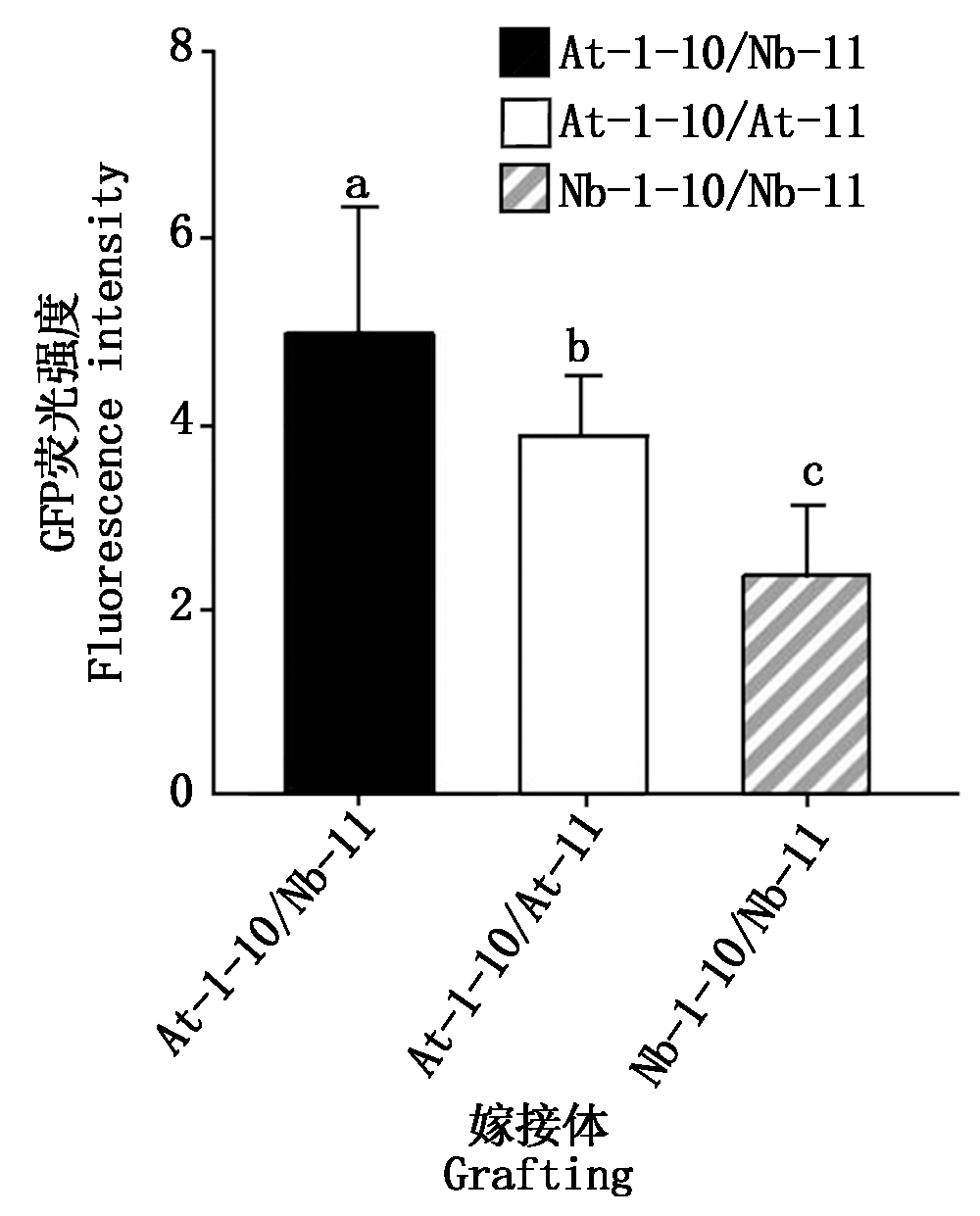 In order to explore how cells from different plant individuals reestablish the connection between scion and stock to form a functional graft,self-assembling split super-folder greenfluorescent protein(sfGFP)system was used to detect the cytoplasm fusion at the graft junction.Transgenic Arabidopsis thaliana and Nicotiana benthamiana plants expressing sfGFP1-10 and mCherry-11 in cytoplasm were obtained by floral dip transformation and leaf disc transformation respectively,and 8-day old T1 transgenic plant were used for grafting.Interfamilial grafts(At-1-10/Nb-11),autografts(At-1-10/At-11,Nb-1-10/Nb-11)and control grafts(At-11/Nb-11,At-11/At-11,Nb-11/Nb-11)were constructed.On the fourth day after grafting,the sfGFP signal at the junction was observed under confocal microscope,and the fluorescence intensity of the grafts was calculated.The results showed that the interfamilial grafts and antografts displayed GFP signal in junction.GFP fluorescence intensity of interfamilial At/Nb grafts was significantly higher than that of autografts.GFP signal was not observed in cells of transgenic Arabidopsis thaliana and Nicotiana benthamiana expressing sfGFP1-10 or mCherry-11 alone and control grafts.These results indicated that at the fourth day,the fusion of cytoplasm at junction readily occurred.The sfGFP fragments were reassembled at the junction through the contact between the stock and the scion targeting in cytoplasm.Moreover,the reassembled fluorescence intensity in the interfamilial At/Nb heterografts was stronger than autografts,suggesting an extensive cellular fusion for At/Nb distant graft.This study provides a new perspective for the cellular events occurring at the graft junction.