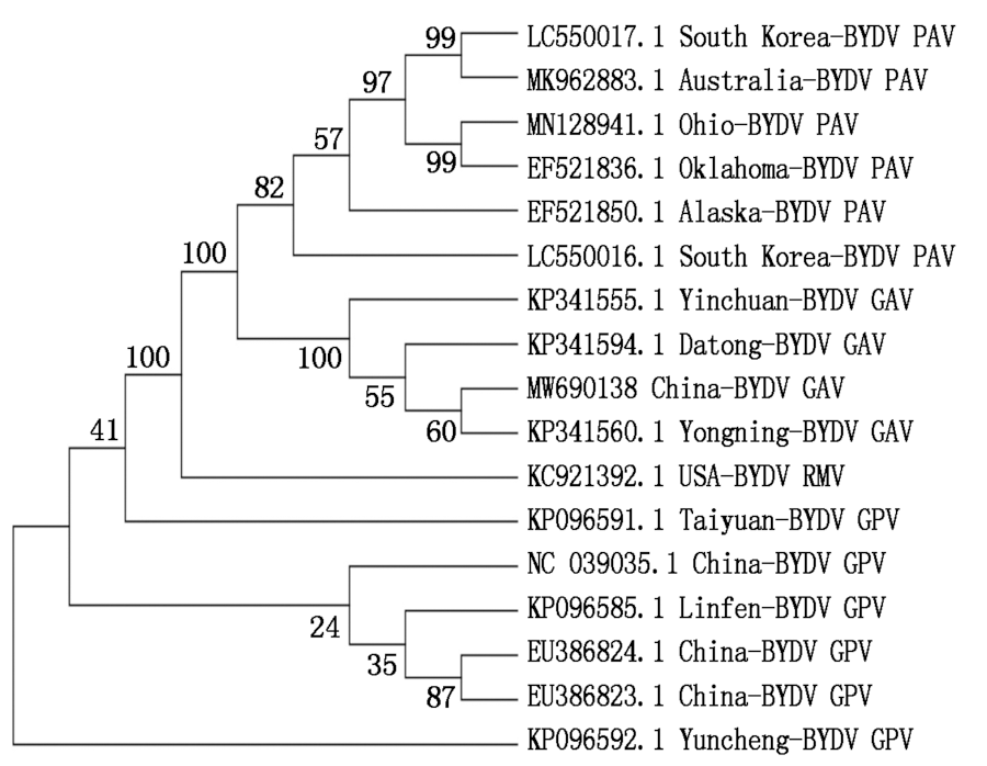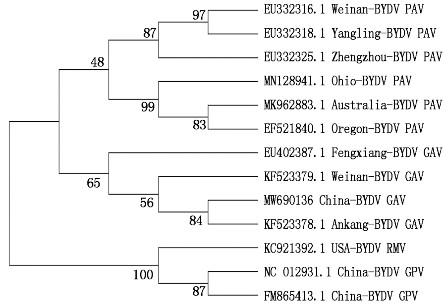 Liu F, Wang X, Liu Y, Xie J, Gray S M, Zhou G, Gao B. A Chinese isolate of Barley yellow dwarf virus-PAV represents a third distinct species within the PAV serotype[J]. Archives of Virology, 2007, 152(7):1365-1373.doi: 10.1007/s00705-007-0947-8.