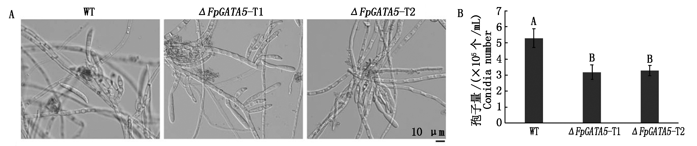 GATA transcription factors play important roles in regulating hyphal growth,conidial production,conidial germination and virulence in phytopathogenic fungi.In order to explore the function of GATA transcription factors in Fusarium pseudograminearum,a total of seven GATA transcription factors encoding genes,which were subsequently named as FpGATA1-FpGATA7,were identified from the genome of F.pseudograminearum using homology searching and domain identification.The full-length sequences of FpGATA genes were 614-3 155 bp,containing one,two or three introns.All FpGATA proteins contained at least one conserved GATA domain,and most of these proteins were alkaline.The quantitative Real-time PCR was used to assay the relative expression levels of FpGATA genes during different infection stages.We found that FpGATA1,FpGATA4,FpGATA5,FpGATA6 and FpGATA7 were induced during the early infection stages,and FpGATA2 was induced in the later infection stage.The FpGATA5 was deleted in F.pseudograminearum by genetic transformation.Compared to the wild-type,the FpGATA5 deletion mutants showed a decrease in hyphal growth and conidial production,and the significantly reduced pathogenicity was observed by barely leaves and wheat coleoptiles inoculation.Overall,the results suggested that the expression of several FpGATA genes was induced during F.pseudograminearum infection,and FpGATA5 played roles in growth,conidiation and pathogenesis of F.pseudograminearum.