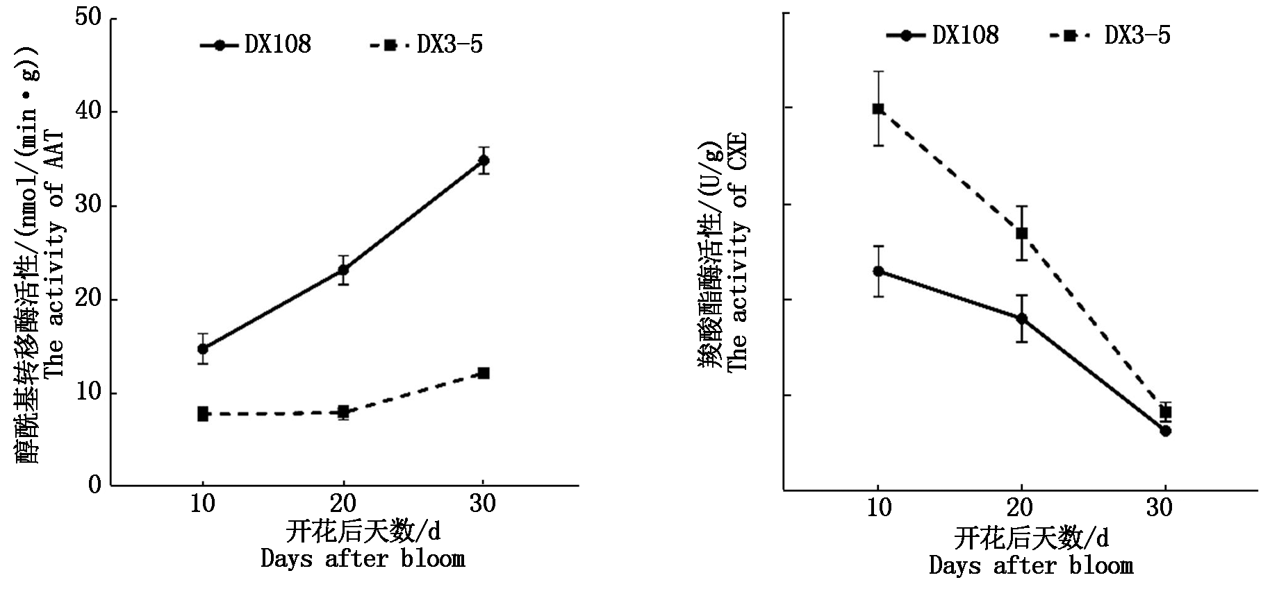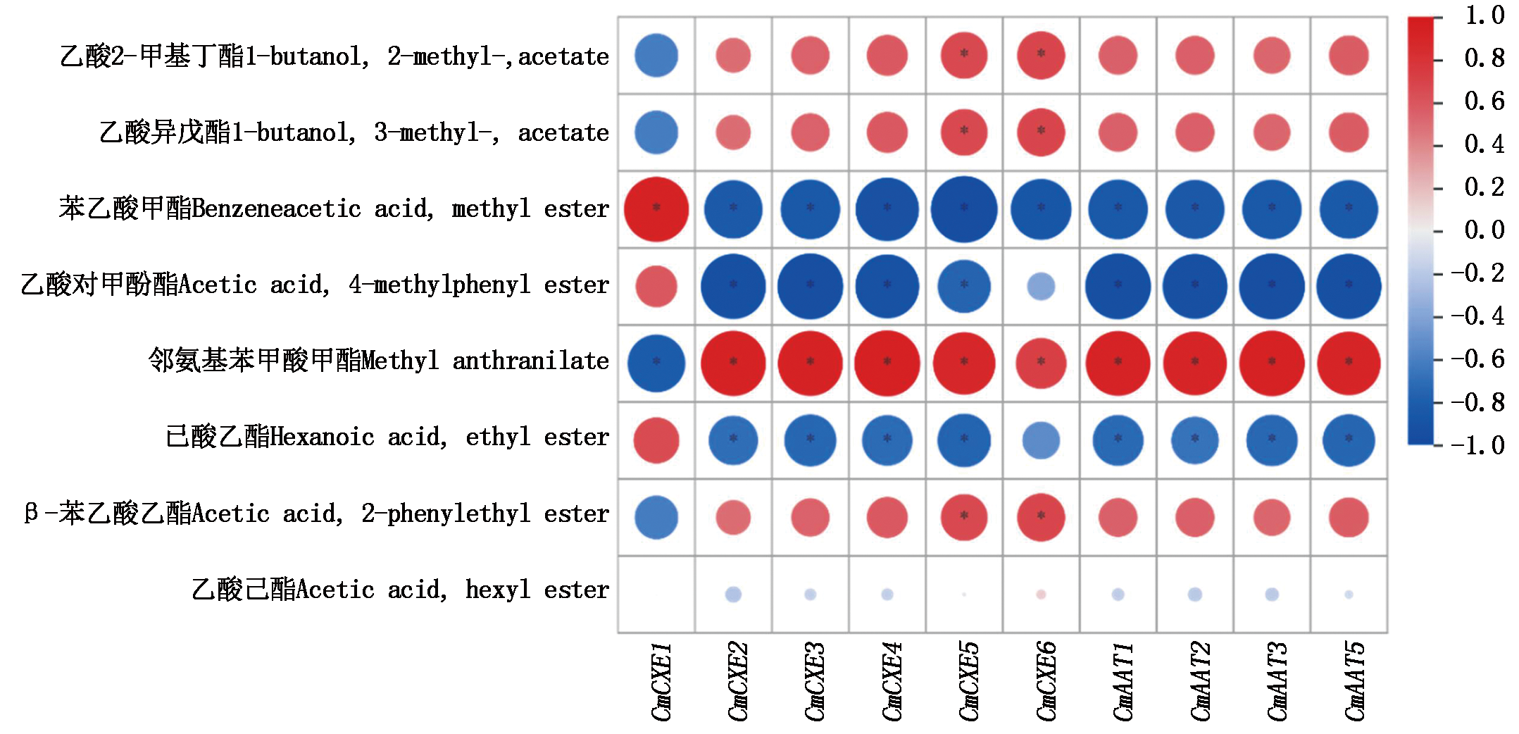 To determine the relationship between the esters compounds and key enzyme activities and genes that involved in the differences in aromas of oriental melon fruits,the disparities of ester metabolites and the enzyme activities and gene expression characteristics of CXE and AAT were investigated,with the fruits of oriental melon,DX108 and DX3-5,used as experimental materials.The results showed that a total of 644 metabolites were detected in oriental melon fruits,including 114 esters.A total of 108 metabolite variations and 23 different esters were detected in mature fruits.Compared with DX3-5,the types and contents of esters in ripe fruits of DX108 increased significantly,indicating that esters were the key substances in the formation of aroma difference in ripe fruits of oriental melons.K-means clustering analysis showed that isoamyl acetate,ethyl 2-methybuyrate,β-ethyl phenylacetate,p-cresol acetate,hexyl acetate ester,methyl phenylacetate,methyl anthranilate and ethyl caproate were the key esters,which caused the difference of ripe fruit aroma between two oriental melons.In addition,the activities of AAT and CXE in fruits showed opposite trend,suggesting that the coordination of AAT and CXE affected the metabolism of esters.The expression characteristics of AAT and CXE gene family members were different with fruit development,and correlation analysis suggested that CmCXE5,CmCXE6 and CmAAT5 were involved in the metabolism of eight different esters in oriental melon ripe fruits.From those findings,the variations in synthesis and accumulation of eight key esters are important reasons that direct the difference in aroma of two kinds of oriental melon,and CmCXE5,CmCXE6 and CmAAT5 may play a major regulatory role.