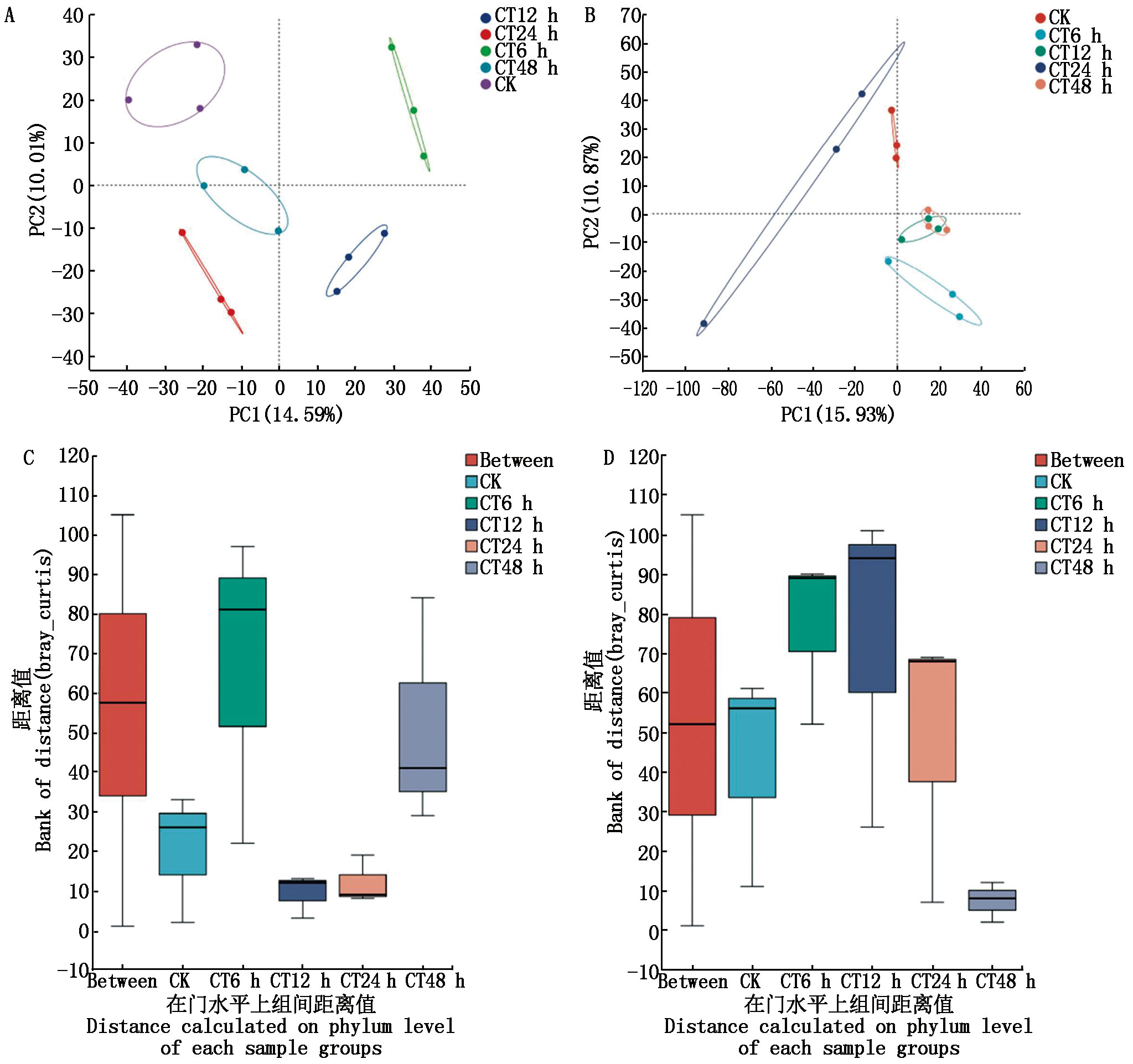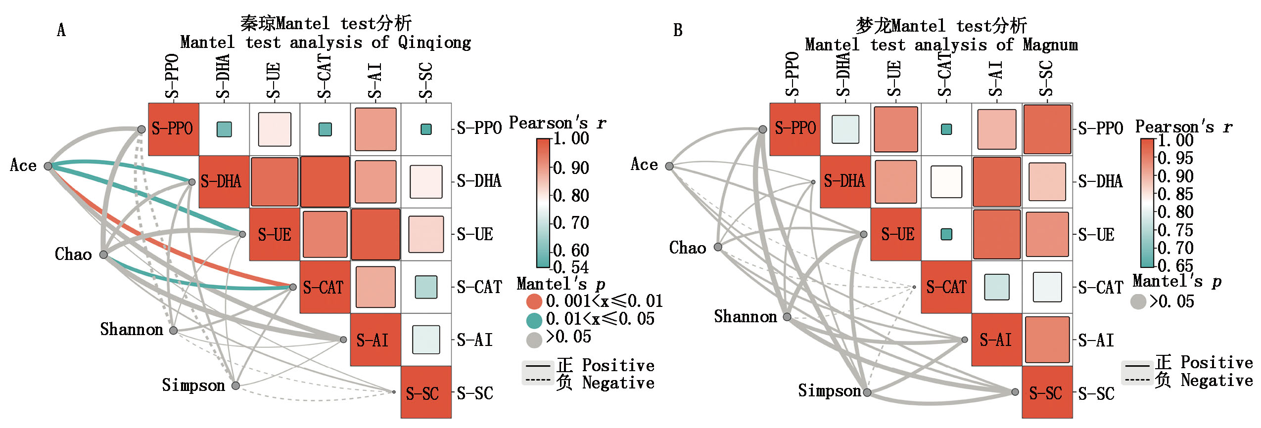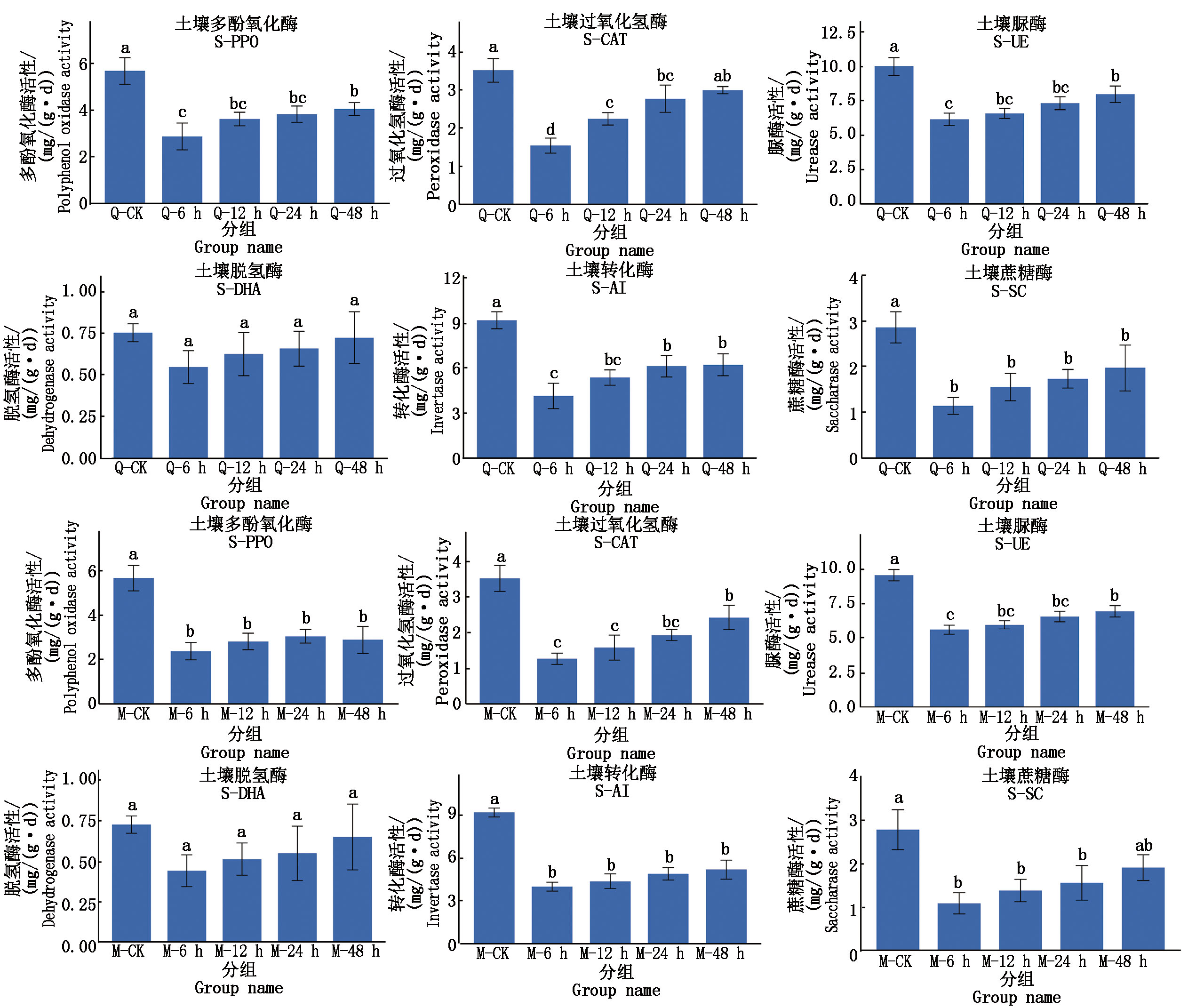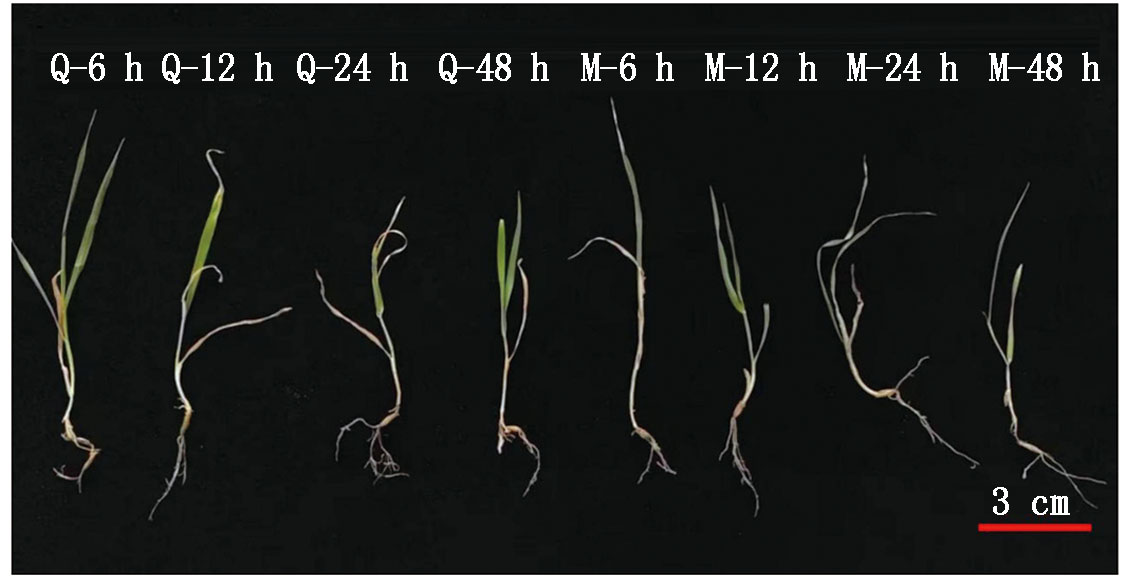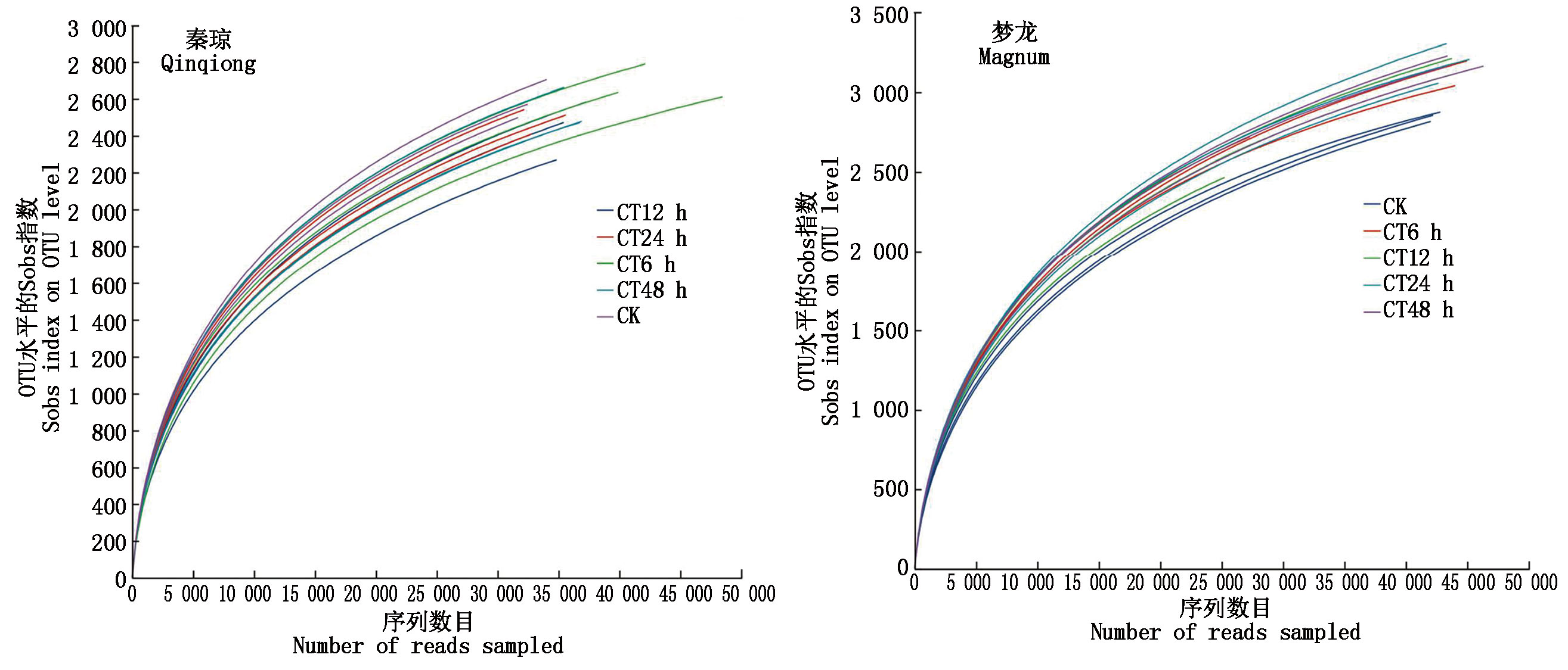 To explore the relationship between soil bacterial community diversity and soil enzyme activity of Qinqiong(Q) and Magnum(M) under salinity stress treatment,the bacterial community structure and soil enzyme activity of Qinqiong and Magnum for 0,6,12,24,48 h were compared and analyzed by using high-throughput sequencing of bacterial 16S rRNA and colorimetry.The results indicated that at the phylum level,the relative abundances of Actinobacteria and Proteobacteria in the rhizosphere soil of Qinqiong were higher than those in Magnum.At the genus level,the relative abundances of Bacillus and Arthrobacter in the rhizosphere soil of Qinqiong were greater than those in Magnum,while the relative abundance of Pseudomonas was lower compared to Magnum.After 48 hours of saline-alkali stress,the activities of soil polyphenol oxidase(S-PPO),soil catalase(S-CAT),soil dehydrogenase(S-DHA),and soil invertase(S-AI) in the rhizosphere of Qinqiong were 1.32,1.53,1.38,and 1.28 times higher than those of Magnum,respectively.Furthermore,the S-CAT activity exhibited a significant positive correlation with the bacterial ACE and Chao diversity indices.Qinqiong may influence changes in bacterial community structure by altering the relative abundances of dominant bacterial groups,thereby enhancing the bacterial community diversity index and soil enzyme activity.In contrast,the changes in the bacterial community within the rhizosphere of Magnum were not significant.The diversity of soil microbial communities is a critical factor determining the saline-alkali tolerance of oat varieties.