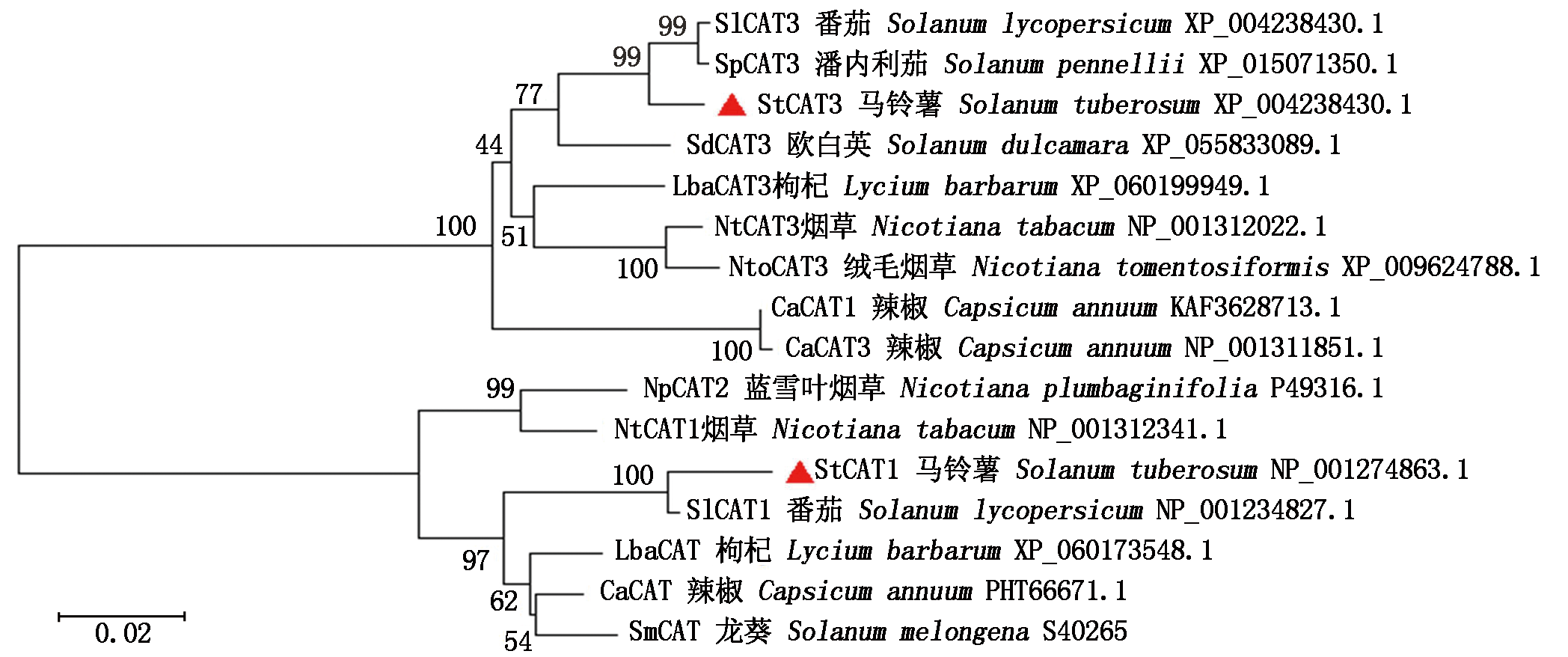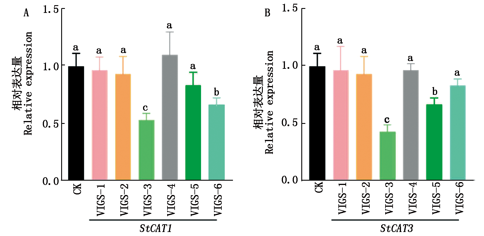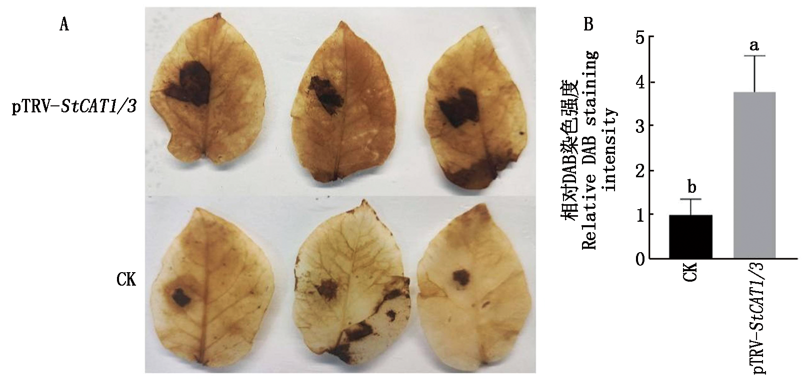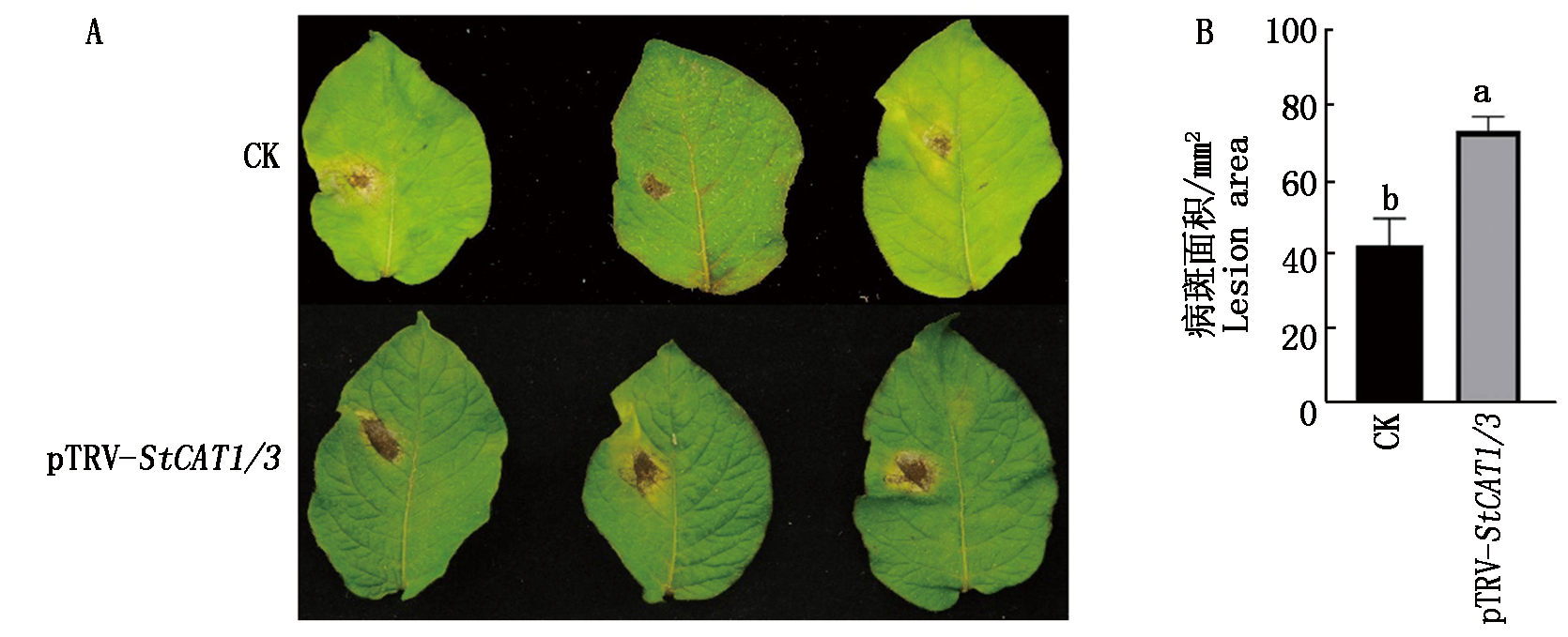 Catalase(CAT)plays a critical role in plant resistance against biotic stresses.To investigate the functions of StCAT1 and StCAT3 in potato defense against Alternaria solani infection,this study cloned the cDNA sequences of StCAT1 and StCAT3 via RT-PCR.Sequencing results demonstrated that both genes were 1 479 bp in length,encoding 493 amino acids.Phylogenetic tree construction revealed that StCAT1 shared high homology with SlCAT1 from tomato,while StCAT3 exhibited high homology with both SlCAT3(tomato)and SpCAT3 from wild tomato.Following A.solani infection for 6 days,the expression of StCAT1 and StCAT3 was significantly upregulated by approximately 3.9-fold and 8.7-fold,respectively.A co-silencing vector targeting both StCAT1 and StCAT3 was constructed,and transient co-silencing was achieved using virus-induced gene silencing(VIGS).qRT-PCR screening identified an effective co-silenced potato line(VIGS-3)with suppressed StCAT1 and StCAT3 expression.Upon A.solani inoculation,the silenced line exhibited 42% larger lesion areas compared to the control,indicating that co-silencing StCAT1/StCAT3 compromised potato resistance to early blight.DAB(3,3'-diaminobenzidine)staining further demonstrated that H2O2 accumulation in co-silenced leaves was significantly elevated,with staining intensity being 3.8-fold higher than that in the control.These results demonstrate that StCAT1 and StCAT3 regulate H2O2 homeostasis to mediate potato resistance against A.solani,providing a theoretical foundation for elucidating the molecular mechanisms of CAT genes in potato-pathogen interactions.