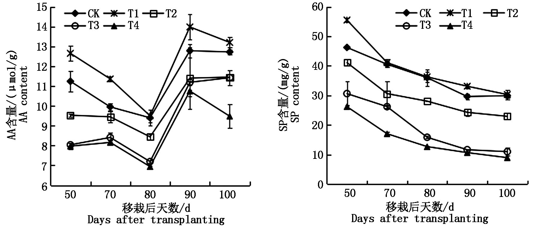 To investigate the effects of optimizing basal-to-topdressing ratios combined with nitrogen application rates on nitrogen metabolism and nitrogen uptake/utilization in flue-cured tobacco,a field experiment was conducted using the cultivar Yueyan 97.Five treatments were designed:conventional basal-to-topdressing ratio (6∶4)+conventional nitrogen rate (CK),basal-to-topdressing ratio (4∶6)+conventional nitrogen rate (T1),basal-to-topdressing ratio (4∶6)+10% nitrogen reduction (T2),basal-to-topdressing ratio (4∶6)+20% nitrogen reduction (T3),and basal-to-topdressing ratio (4∶6)+30% nitrogen reduction (T4).It analyzed the impacts of these treatments on nitrogen metabolism,photosynthetic characteristics,dry matter accumulation,nitrogen uptake,nitrogen use efficiency,and nitrogen balance.The results showed that after optimizing the basal-to-topdressing ratio to 4∶6,the activities of key nitrogen metabolism enzymes,including glutamate dehydrogenase (GDH),aspartate transaminase (AST),and ferredoxin-glutamate synthase (Fd-GOGAT),were all higher than those under the traditional basal-to-topdressing ratio of 6∶4.When combined with nitrogen reduction treatments,the activities of nitrogen metabolism enzymes decreased.Specifically,T2 (10% nitrogen reduction) showed no significant difference from CK,while T3 and T4 (20%—30% nitrogen reduction) exhibited marked declines in enzyme activity.Optimizing the basal-to-topdressing ratio to 4∶6 also improved photosynthetic rate,SPAD values,dry matter accumulation,and nitrogen accumulation,with significant differences observed during the late growth stages.Furthermore,the optimizing 4∶6 ratio significantly enhanced nitrogen use efficiency.Compared to CK,nitrogen agronomic efficiency,partial factor productivity,recovery efficiency,and economic utilization efficiency increased by 20.68%,6.89%,4.06 percentage points,and 3.78 percentage points,respectively.Nitrogen reduction treatments reduced soil nitrogen surplus by 17.04—33.36 percentage points compared to CK.In conclusion,optimizing the basal-to-topdressing ratio from 6∶4 to 4∶6 in southern tobacco-growing regions enhances nitrogen metabolism during mid-to-late growth stages,improved photosynthetic performance,promotes dry matter and nitrogen accumulation,and increased nitrogen use efficiency.Coupled with 10% reduction in fertilizer can also reduce fertilizer input,mitigetes soil nitrogen surplus,and prevent environmental risks.