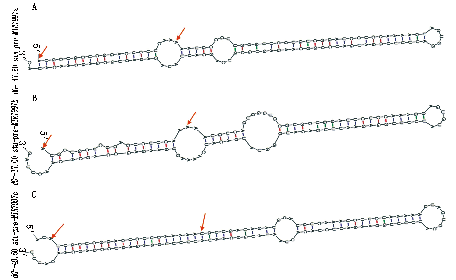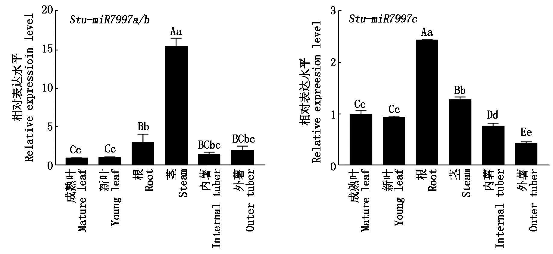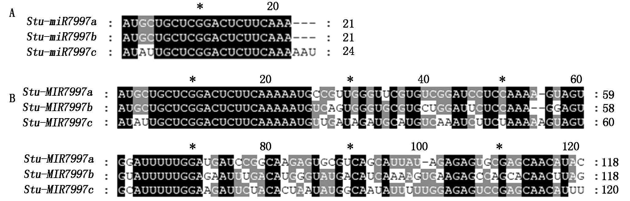 To investigate the molecular mechanisms of the potato miR7997 family in response to Phytophthora infestans infection,this study analyzed the sequence characteristics,target gene prediction,expression patterns,and stress-responsive expression dynamics of Stu-miR7997 and its targets using the potato cultivar Desiree.The results revealed that the potato miR7997 family comprised three members(Stu-miR7997a/b/c)distributed across two chromosomes,with Stu-miR7997a/b sharing identical mature sequences.All precursor sequences formed canonical stem-loop secondary structures,with minimum folding free energies ranging from -37.00 to -49.50 kcal/mol,and mature sequences were located on the 5' arm.Stu-miR7997c exhibited distinct sequence length and functional element distribution compared to Stu-miR7997a/b.Promoter analysis identified light-responsive,hormone-responsive,transcription factor-binding,and stress defense-related cis-regulatory elements;target prediction identified 19 genes predominantly co-regulated by the miR7997 family.Tissue-specific expression profiling showed that Stu-miR7997a/b were highly expressed in stems,while Stu-miR7997c accumulated predominantly in roots.Upon P.infestans infection,all miR7997 members were significantly downregulated,whereas their target genes-including the transcription factor MYB92 gene,NAD(P)H-quinone oxidoreductase gene,and pectin lyase gene-were markedly upregulated.These findings suggest that the Stu-miR7997 family may indirectly modulate potato disease resistance by negatively regulating target genes.This study provides a theoretical foundation for further exploration of the miR7997 family in potato late blight resistance.