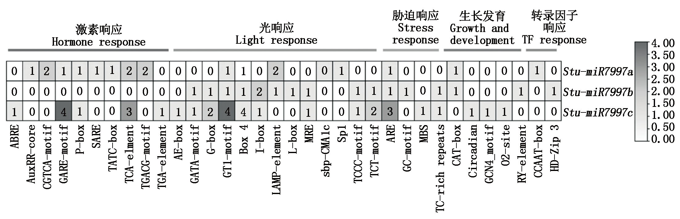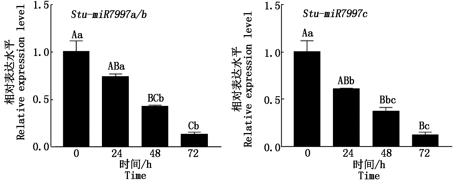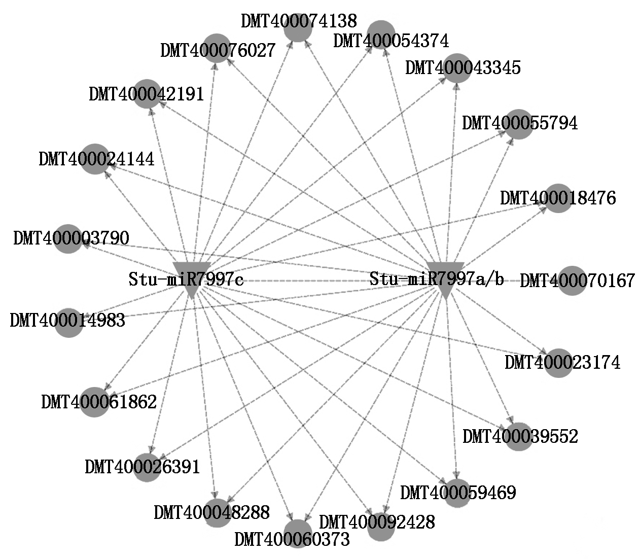 To investigate the molecular mechanisms of the potato miR7997 family in response to Phytophthora infestans infection,this study analyzed the sequence characteristics,target gene prediction,expression patterns,and stress-responsive expression dynamics of Stu-miR7997 and its targets using the potato cultivar Desiree.The results revealed that the potato miR7997 family comprised three members(Stu-miR7997a/b/c)distributed across two chromosomes,with Stu-miR7997a/b sharing identical mature sequences.All precursor sequences formed canonical stem-loop secondary structures,with minimum folding free energies ranging from -37.00 to -49.50 kcal/mol,and mature sequences were located on the 5' arm.Stu-miR7997c exhibited distinct sequence length and functional element distribution compared to Stu-miR7997a/b.Promoter analysis identified light-responsive,hormone-responsive,transcription factor-binding,and stress defense-related cis-regulatory elements;target prediction identified 19 genes predominantly co-regulated by the miR7997 family.Tissue-specific expression profiling showed that Stu-miR7997a/b were highly expressed in stems,while Stu-miR7997c accumulated predominantly in roots.Upon P.infestans infection,all miR7997 members were significantly downregulated,whereas their target genes-including the transcription factor MYB92 gene,NAD(P)H-quinone oxidoreductase gene,and pectin lyase gene-were markedly upregulated.These findings suggest that the Stu-miR7997 family may indirectly modulate potato disease resistance by negatively regulating target genes.This study provides a theoretical foundation for further exploration of the miR7997 family in potato late blight resistance.