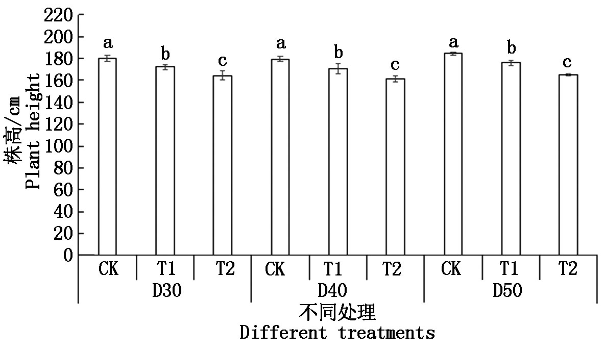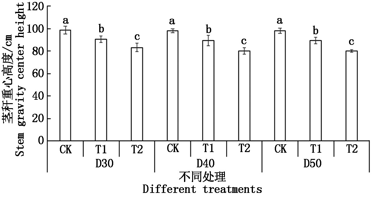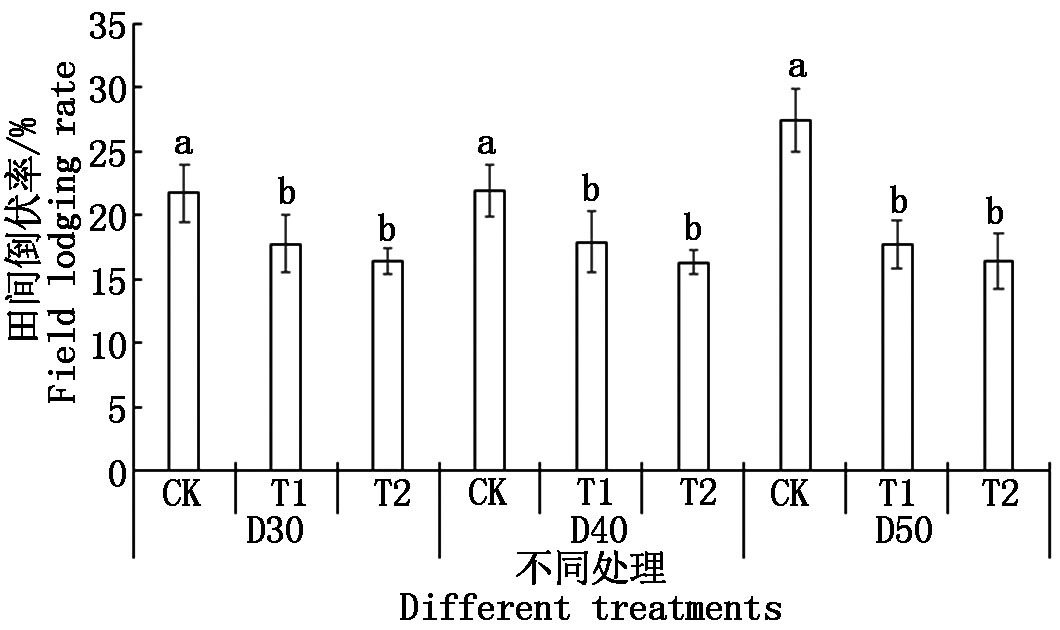 To investigate the effects of row spacing and chlormequat chloride application on lodging resistance and yield performance of foxtail millet in Southeastern Shanxi,a two-factor randomized block design was employed,utilizing Jingu 21 as the experimental material.The experimental design included three row spacing levels(30,40,and 50 cm,designated as D30,D40,and D50,respectively)and three chlormequat chloride treatment regimes:spraying with water only(CK),single application at the six-leaf stage(T1),and sequential applications at both the six-and eight-leaf stages(T2).This resulted in a total of nine treatment combinations.The study evaluated the impacts of these treatments on stem morphological characteristics,lodging incidence,grain yield,and its component traits.Results showed that chlormequat chloride application under varying row spacing conditions significantly improved stem breaking resistance while significantly reducing plant height,center-of-gravity height,and field lodging rate.The D40+T2 treatment exhibited the highest stem breaking resistance(94.59 N)and concurrently achieved the lowest values for plant height(161.53 cm),center-of-gravity height(80.3 cm),and lodging rate(16.31%).In terms of yield,as row spacing increased,the yield of CK,T1,and T2 treatments all showed a decreasing trend.Among them,the D30+T1 treatment achieved the highest yield of 4 923.83 kg/ha.Correlation analysis indicated that under different row spacing and chlormequat treatments,millet yield was mostly positively correlated with plant height and panicle traits,while consistently negatively correlated with lodging rate.This demonstrates that optimizing row spacing and chlormequat application can effectively regulate key agronomic traits.In conclusion,optimizing row spacing along with appropriate chlormequat treatment can effectively minimize the risk of lodging while maintaining yield.The D30+T1 treatment demonstrated superior overall performance and is therefore recommended for broader adoption in foxtail millet cultivation in Southeastern Shanxi.