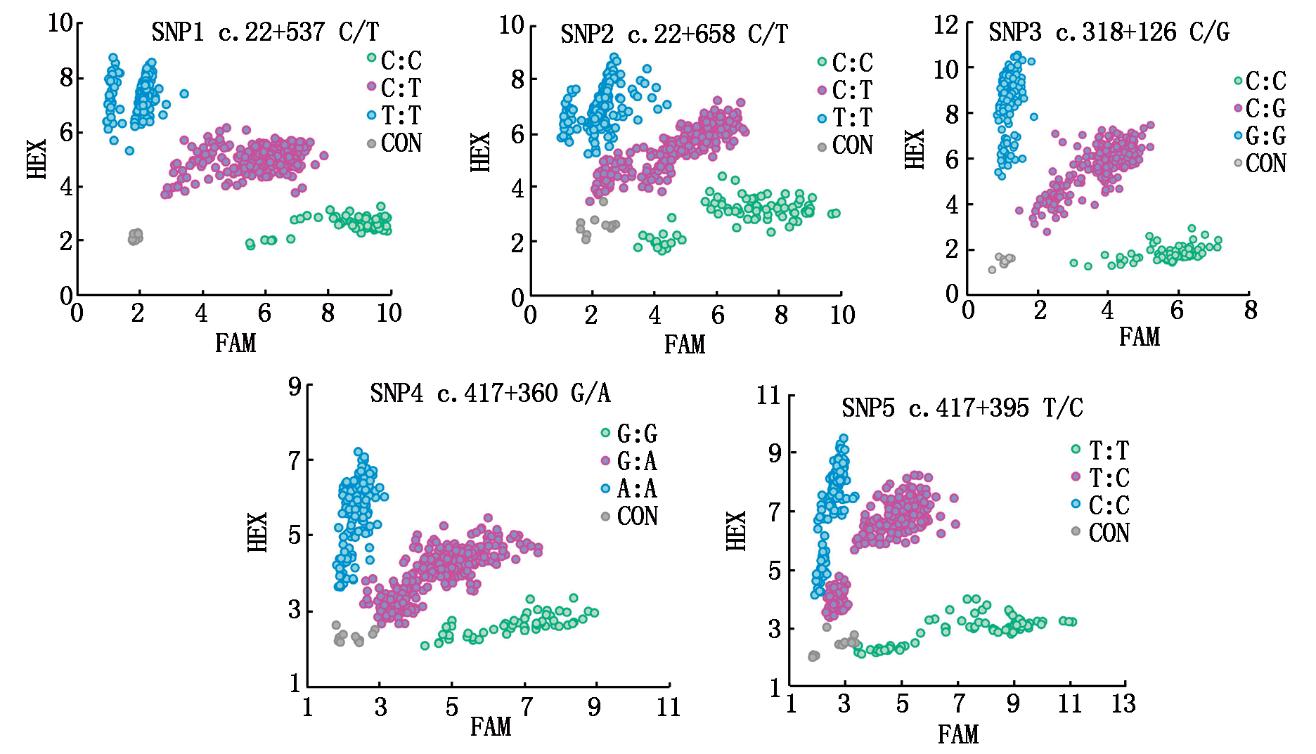 Fat storage inducing transmembrane protein 2 (FITM2) plays an important role in regulating lipid storage and skeletal muscle energy metabolism.To scan the polymorphisms of the FITM2 gene in sheep and investigate its relationship with growth traits in Hu sheep,the experiment selected 1 128 healthy and disease-free,genetically well-documented Hu sheep as the experimental group,and used the FITM2 gene in sheep as the research object.First,the expression differences of the FITM2 gene in different tissues were analyzed using qPCR technology.Then,the genetic polymorphisms of the FITM2 gene in sheep were detected using PCR amplification,Sanger sequencing,and AQP (allele-specific quantitative PCR-based genotyping assay).Finally,the association between the genetic polymorphisms and growth traits was analyzed.The research results showed that the FITM2 gene was expressed in different tissues of Hu sheep,with the highest expression level in the tail fat and significantly higher than that in other tissues.The gene polymorphism detection results showed that there was a C>T mutation at position 72704027 in the first intron of the FITM2 gene.The results of correlation analysis showed that the 100,120 d body weight,140,160 d body height,80,120,140,160 d body length,and 100 d chest circumference of CC genotype individuals were significantly higher than those of TT genotype individuals.In summary,the FITM2 gene g.72704027 C>T mutation site in sheep can be used as a candidate molecular marker related to growth traits in Hu sheep,providing a theoretical basis for the genetic breeding work of Hu sheep.
