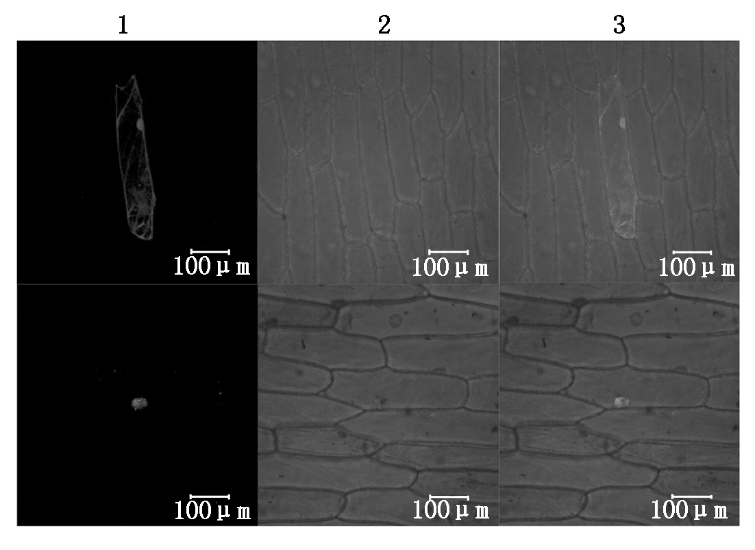 利用单酶切方法构建了亚细胞定位载体HBT-GmZHD1(图5),然后用基因枪将HBT-GmZHD1载体转化洋葱表皮细胞,空载HBT-sGFP(S65T)-NOS作为阳性对照。亚细胞定位显示在洋葱表皮细胞的细胞核中可以检测到GFP信号(图6),初步证明GmZHD1定位于细胞核。