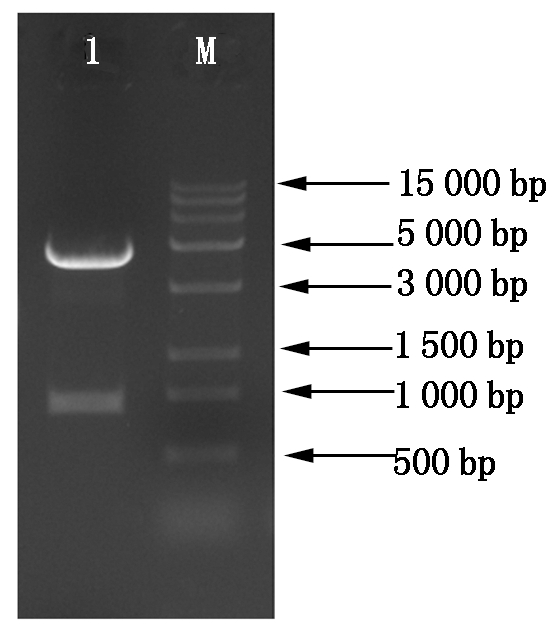 1.XhoⅠ/SacⅠ酶切片段;M.DL15000 DNA Marker。1.Fragments of vector digested by Xho Ⅰ/Sac Ⅰ;M.DL15000 DNA Marker.