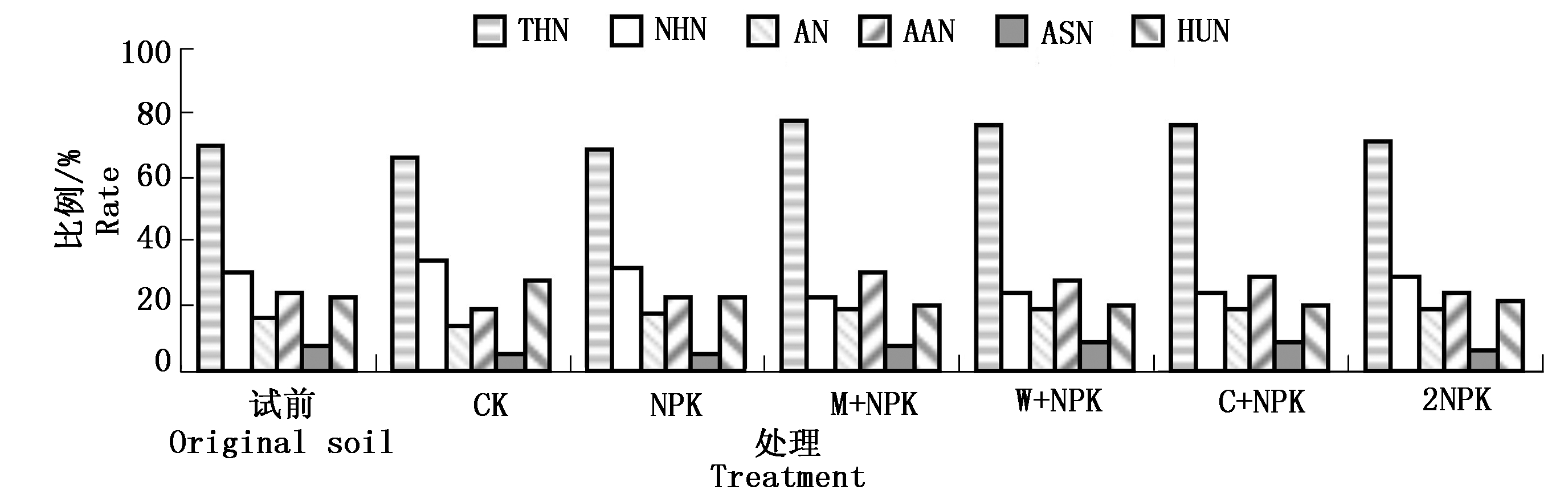 THN.酸解性总氮;AN.铵态氮;AAN.氨基酸态氮;ASN.氨基糖态氮;HUN.酸解未知态氮;NHN.酸不溶性氮。图2-4同。