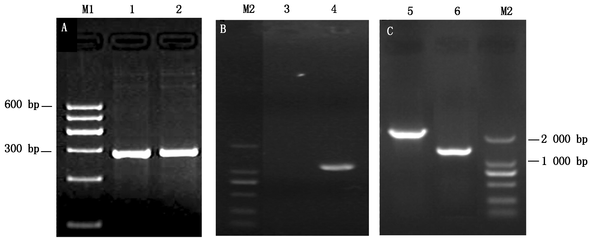 图1 ssnA基因上、下游序列及Cm基因扩增产物电泳图