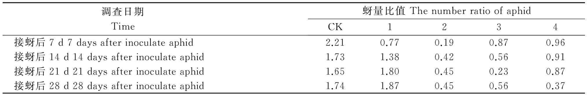 调查日期 Time 蚜量比值ThenumberratioofaphidCK1234接蚜后7d7daysafterinoculateaphid2.210.770.190.870.96接蚜后14d14daysafterinoculateaphid1.731.380.420.560.91接蚜后21d21daysafterinoculateaphid1.651.800.450.230.87接蚜后28d28daysafterinoculateaphid1.741.870.450.560.37