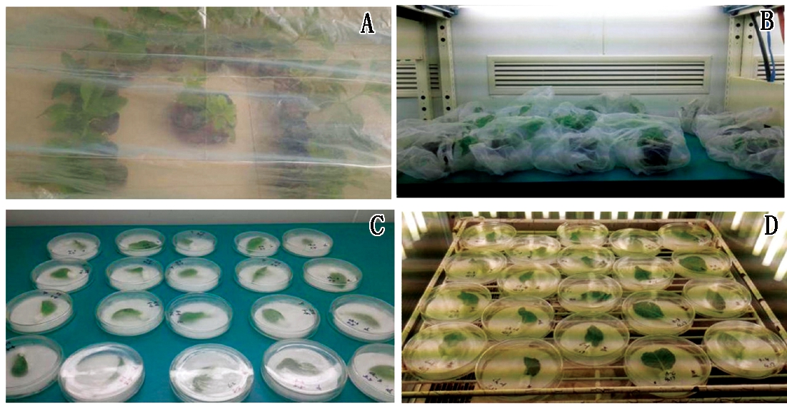 A.感蚜性试验;B.转基因植株抗蚜试验;C.离体叶片蚜量测定;D.离体叶片蚜虫生殖能力测定。
