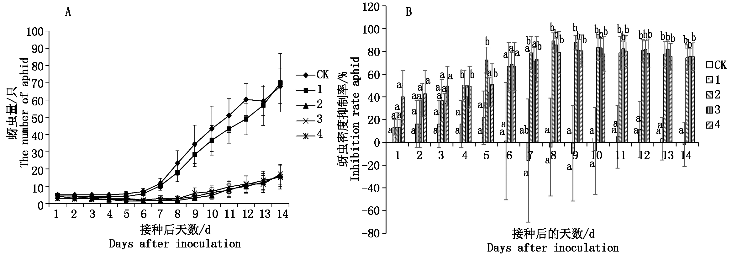 蚜虫密度抑制率=(对照植株虫数-参试植株虫数)/对照植株虫数×100%;