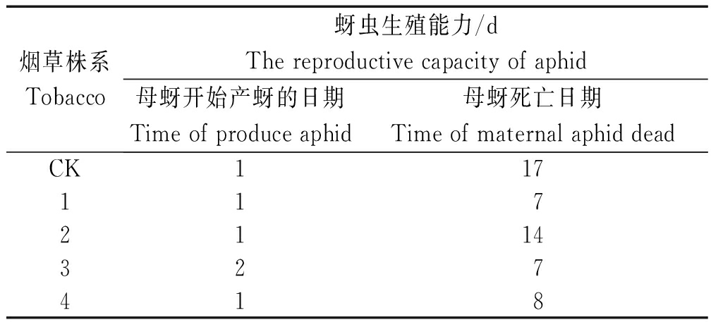 烟草株系Tobacco蚜虫生殖能力/dThereproductivecapacityofaphid母蚜开始产蚜的日期Timeofproduceaphid母蚜死亡日期TimeofmaternalaphiddeadCK1171172114327418