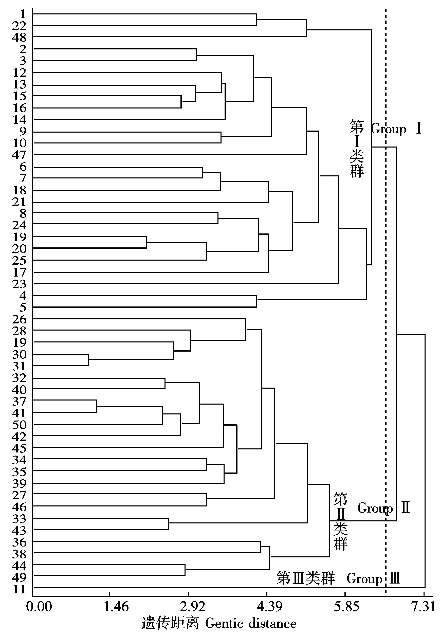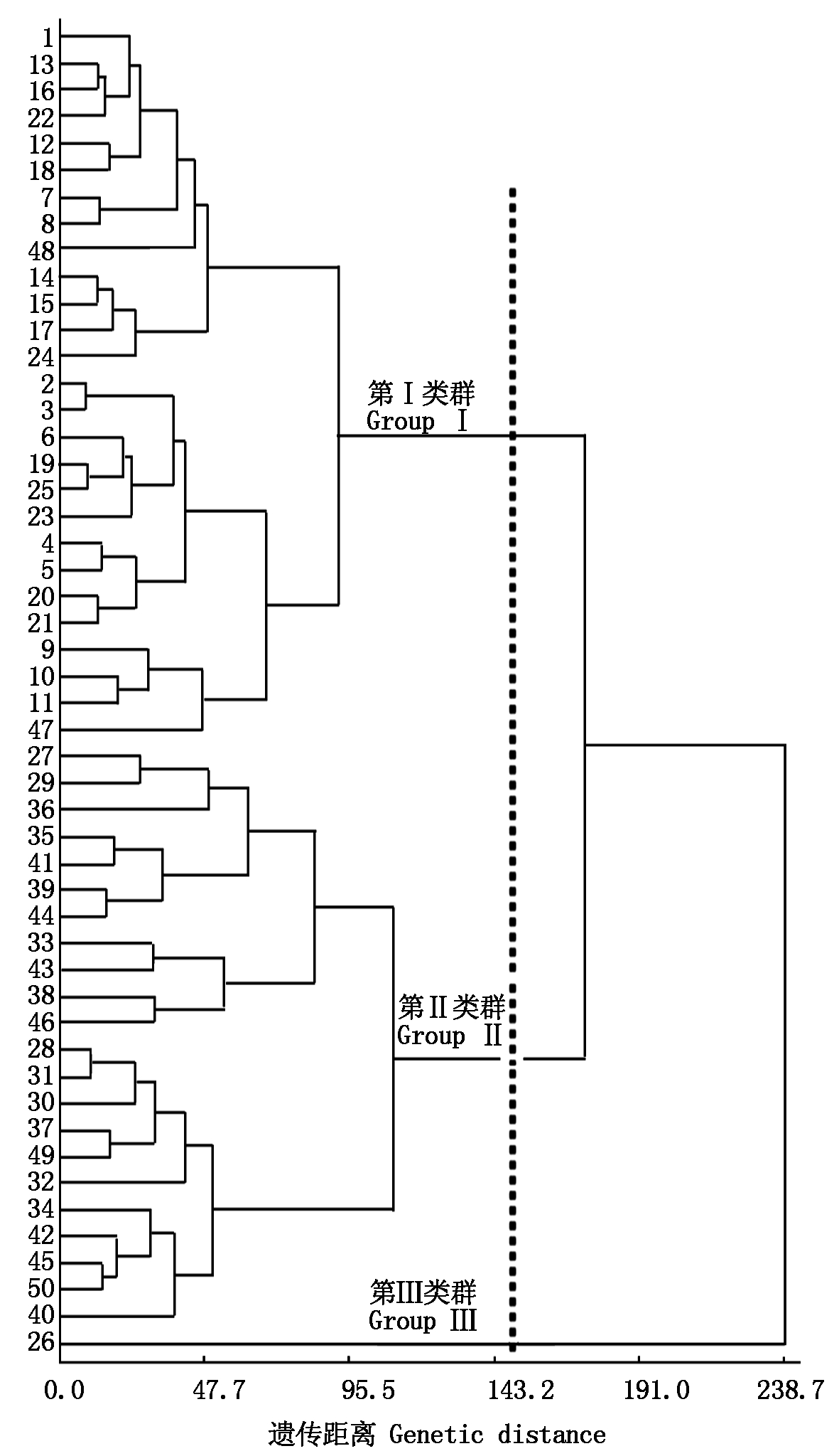为研究参试向日葵种质资源在分子水平的遗传关系,采用SPSS软件,利用19条RAPD引物计算了50份种质间的遗传距离。这些种质资源的遗传距离为0.812~0.241,均值为0.563,可见参试种质在分子水平上遗传差异较大,从而验证了各材料多态性研究结果。在种质间的遗传距离中,种质16(T752)与24(T837)间的遗传距离最大,为0.812;种质6(T663)和种质5(T660)遗传距离最小,为0.241。根据19条RAPD引物计算得到的种质间遗传距离,对50份种质进行聚类分析,供试种质可分为三大类群(图3)。