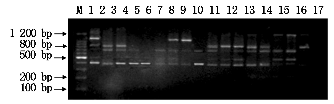 相异性系数与聚类分析方法:相异系数与聚类分析均采用SPSS分析软件进行分析,以RAPD条带为基础建立的0,1矩阵计算Jaccard相异系数[14],公式如下:Jij=a /(n-d),a为i品种和j品种的多态性条带数之和,n为RAPD总带数,d为i和j品种都记为0的带数。然后用非加权配对算术平均聚类方法(UPGMA)对其进行聚类分析。