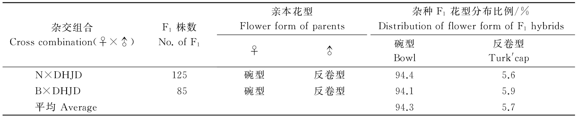 杂交组合Crosscombination(♀×♂)F1株数No.ofF1亲本花型Flowerformofparents杂种F1花型分布比例/%DistributionofflowerformofF1hybrids♀♂碗型Bowl反卷型Turk'capN×DHJD125碗型反卷型94.45.6B×DHJD85碗型反卷型94.15.9平均Average94.35.7