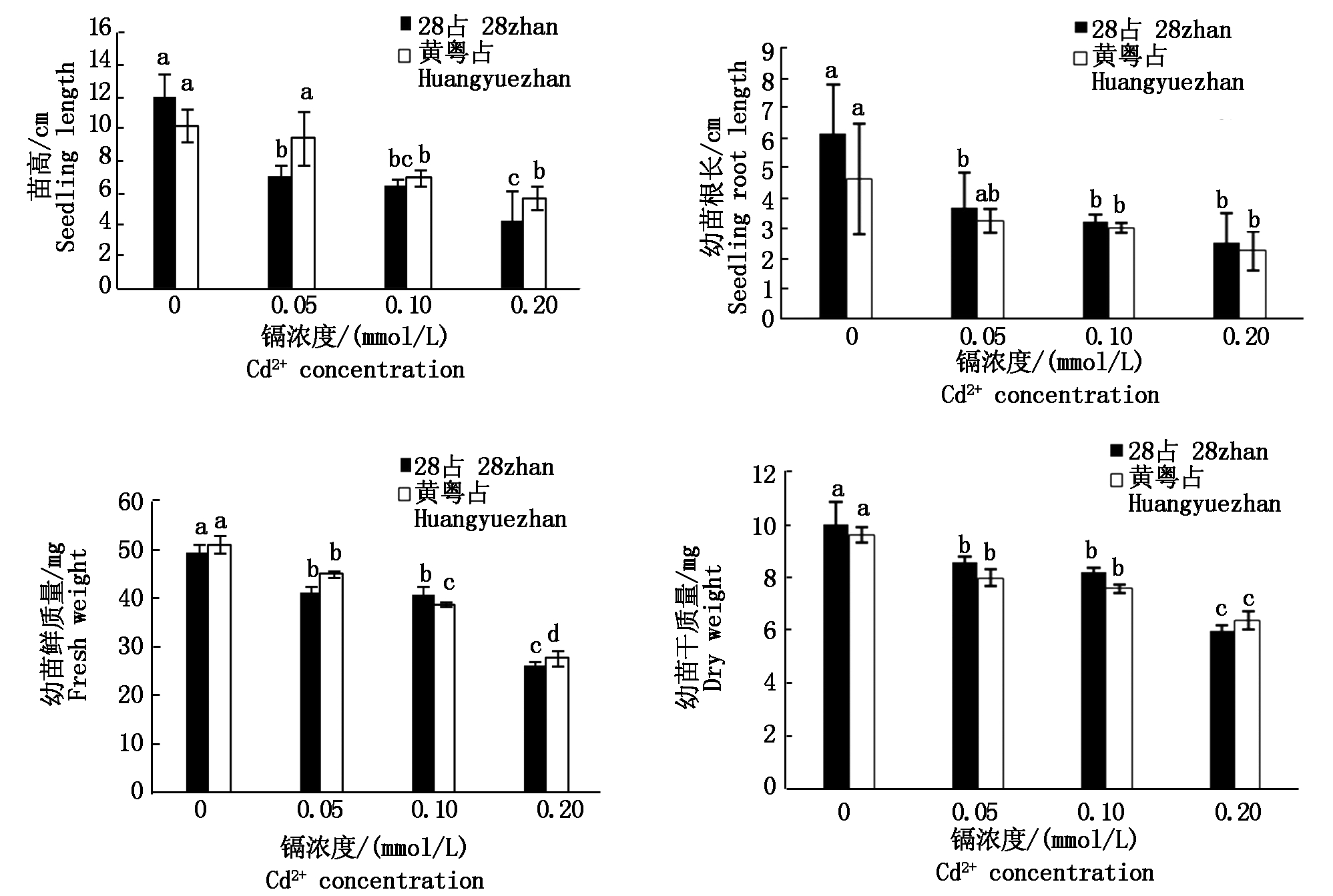 本研究结果表明,镉胁迫可导致水稻种子萌发幼苗生长迟缓,幼苗矮化,干物质积累减少。由图1可见,在不同镉胁迫浓度处理下,28占和黄粤占2个供试水稻品种的幼苗苗高、根长、鲜质量和干质量均随着镉胁迫处理浓度的增大呈下降趋势。其中镉胁迫处理下,水稻品种28占的苗高较对照的显著减小(P<0.05),低浓度(0.05 mmol/L Cd2+)胁迫处理下的苗高较对照的下降了41%;0.05 mmol/L Cd2+胁迫处理下,水稻品种黄粤占的苗高下降幅度不显著,0.10 mmol/L Cd2+胁迫处理的苗高则显著降低,较对照的降低了32%。镉胁迫处理下,28占的幼苗根长比对照的显著减小,但各镉胁迫处理间的差异未达显著水平;黄粤占的幼苗根长受0.05 mmol/L镉胁迫处理的影响未达显著水平。28占的幼苗鲜质量与幼苗干质量的镉胁迫效应表现一致,各种镉胁迫处理的幼苗鲜质量与幼苗干质量较对照的降低幅度均较大,但0.05,0.10 mmol/L 2种镉胁迫处理间的差异未达显著水平;水稻品种黄粤占的幼苗鲜质量随镉胁迫处理浓度的增大而显著减小,镉胁迫对其幼苗干质量具有显著影响。
