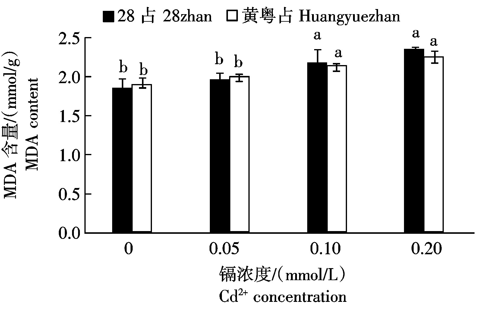 2.3.2 镉胁迫对不同水稻品种幼苗MDA含量的影响 由图3可以看出,供试2个水稻品种黄粤占与28占的幼苗叶片MDA含量(以鲜质量计)随着镉胁迫浓度的增大而增加,且2个水稻品种的表现基本一致。不加Cd2+和0.05 mmol/L Cd2+镉胁迫处理下,黄粤占的幼苗叶片MDA含量稍高于28占,而0.10,0.20 mmol/L Cd2+镉胁迫下,黄粤占的幼苗叶片MDA含量却低于水稻品种28占,说明黄粤占的MDA含量相对稳定性可能与其具有较好的种子萌发幼苗期镉胁迫抗性有关。0.05 mmol/L Cd2+较低镉胁迫浓度处理下,2个供试水稻品种黄粤占与28占的MDA含量较对照的变化不大,而镉胁迫处理浓度增大到0.10 mmol/L时,2个供试水稻品种黄粤占与28占的MDA含量较对照的差异均达到了显著水平。