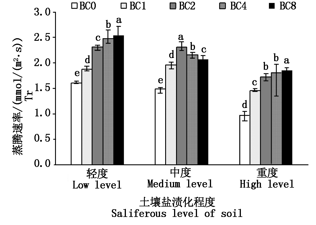 图5 生物质炭输入盐渍化土壤对玉米幼苗叶片蒸腾速率的影响