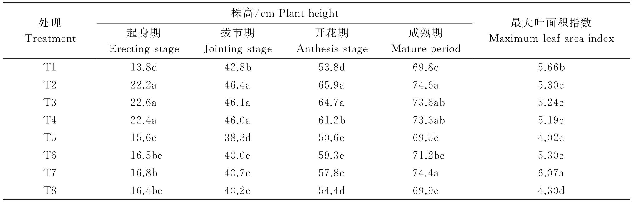 处理Treatment株高/cmPlantheight起身期Erectingstage拔节期Jointingstage开花期Anthesisstage成熟期Matureperiod最大叶面积指数MaximumleafareaindexT113.8d42.8b53.8d69.8c5.66bT222.2a46.4a65.9a74.6a5.30cT322.6a46.1a64.7a73.6ab5.24cT422.4a46.0a61.2b73.3ab5.19cT515.6c38.3d50.6e69.5c4.02eT616.5bc40.0c59.3c71.2bc5.30cT716.8b40.7c57.8c74.4a6.07aT816.4bc40.2c54.4d69.9c4.30d