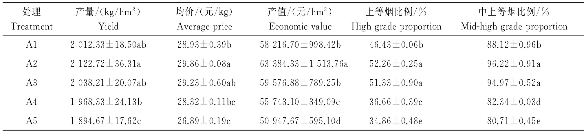 处理Treatment产量/(kg/hm2)Yield均价/(元/kg)Averageprice产值/(元/hm2)Economicvalue上等烟比例/%Highgradeproportion中上等烟比例/%Mid-highgradeproportionA12012.33±18.50ab28.93±0.39b58216.70±998.42b46.43±0.06b88.12±0.96bA22122.72±36.31a29.86±0.08a63384.33±1513.76a52.26±0.25a96.22±0.91aA32038.21±20.07ab29.23±0.60ab59576.88±789.25b51.33±0.90a94.97±0.52aA41968.33±24.13b28.32±0.11bc55743.10±349.09c36.66±0.39c82.34±0.03dA51894.67±17.62c26.89±0.19c50947.67±595.10d34.86±0.48e80.71±0.45e