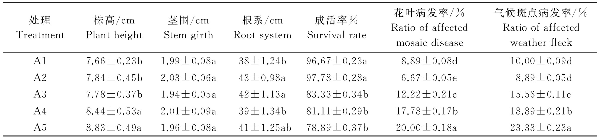 处理Treatment株高/cmPlantheight茎围/cmStemgirth根系/cmRootsystem成活率%Survivalrate花叶病发率/%Ratioofaffectedmosaicdisease气候斑点病发率/%RatioofaffectedweatherfleckA17.66±0.23b1.99±0.08a38±1.24b96.67±0.23a8.89±0.08d10.00±0.09dA27.84±0.45b2.03±0.06a43±0.98a97.78±0.28a6.67±0.05e8.89±0.05dA37.78±0.37b1.94±0.05a42±1.13a83.33±0.34b12.22±0.21c15.56±0.11cA48.44±0.53a2.01±0.09a39±1.34b81.11±0.29b17.78±0.17b18.89±0.21bA58.83±0.49a1.96±0.08a41±1.25ab78.89±0.37b20.00±0.18a23.33±0.23a