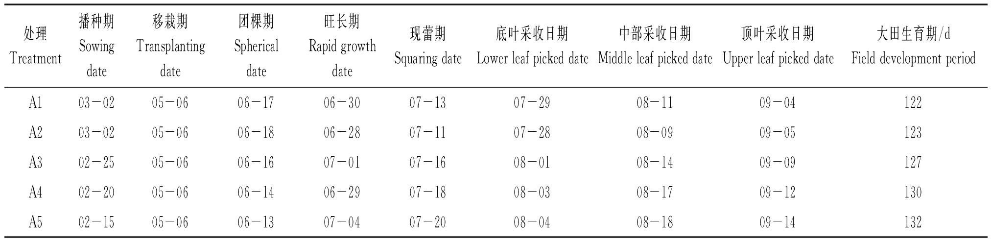 处理Treatment播种期Sowingdate移栽期Transplantingdate团棵期Sphericaldate旺长期Rapidgrowthdate现蕾期Squaringdate底叶采收日期Lowerleafpickeddate中部采收日期Middleleafpickeddate顶叶采收日期Upperleafpickeddate大田生育期/dFielddevelopmentperiodA103-0205-0606-1706-3007-1307-2908-1109-04122A203-0205-0606-1806-2807-1107-2808-0909-05123A302-2505-0606-1607-0107-1608-0108-1409-09127A402-2005-0606-1406-2907-1808-0308-1709-12130A502-1505-0606-1307-0407-2008-0408-1809-14132