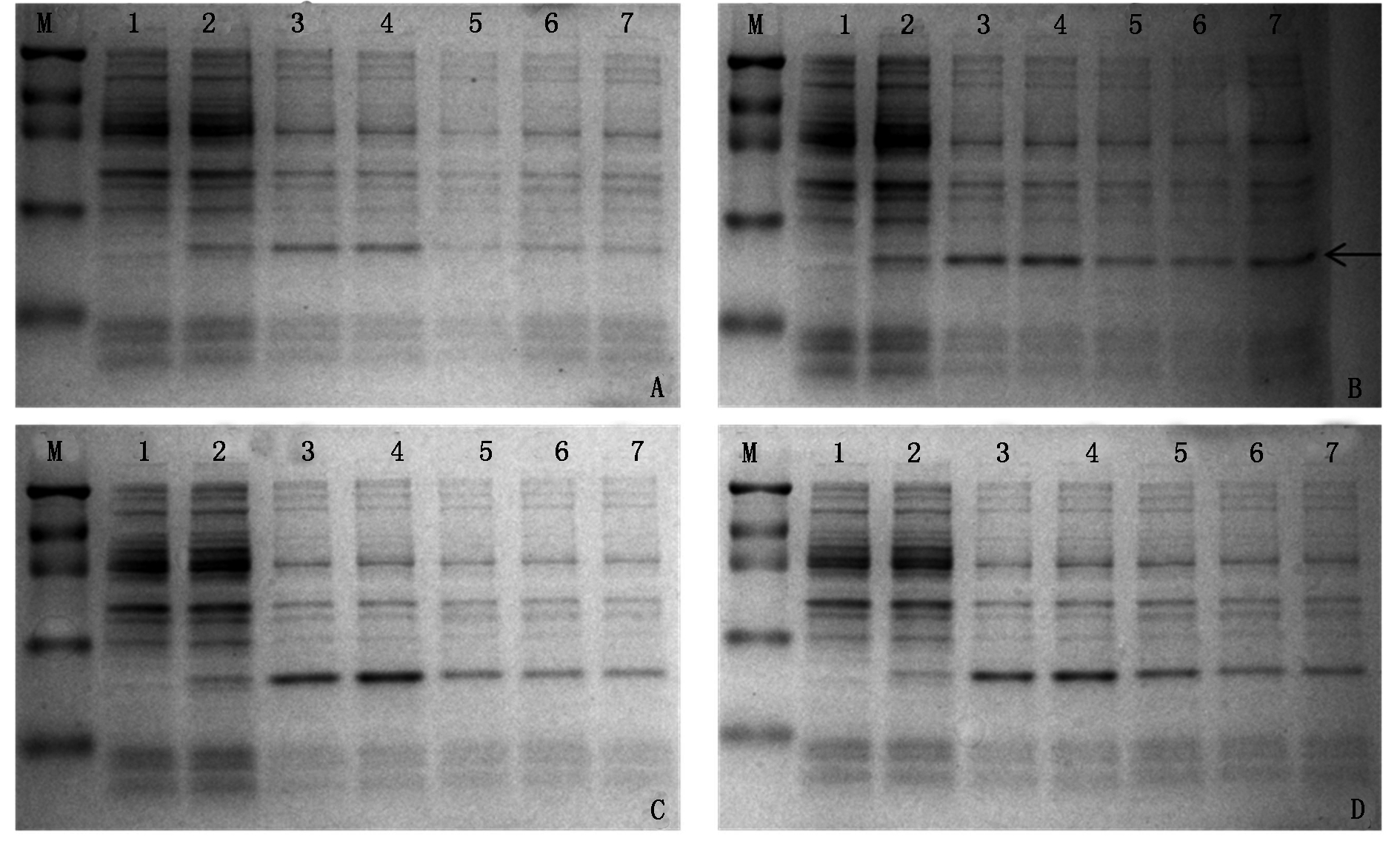 M.蛋白Marker(94,60,45,27,18 kDa);1.未经IPTG诱导的载体pET-28a(+);2.未经IPTG诱导的重组子pET-28a-OoADF1;3~7.经终浓度分别为0.1,0.2,0.5,0.8,1.0 mmol/L的IPTG诱导重组子pET-28a-OoADF1;A、B、C、D分别为经IPTG诱导1,2,3,4 h;箭头是特异蛋白。M.Protein Marker(94,60,45,27,18 kDa);1.pET-28a(+) with no IPTG induce;2.pET-28a-OoADF1 with no IPTG induce;3-7.pET-28a-OoADF1 with IPTG induce(final concentration:0.1,0.2,0.5,0.8,1.0 mmol/L);A,B,C,D.IPTG induce with 1,2,3,4 h;Arrow is specific protein.