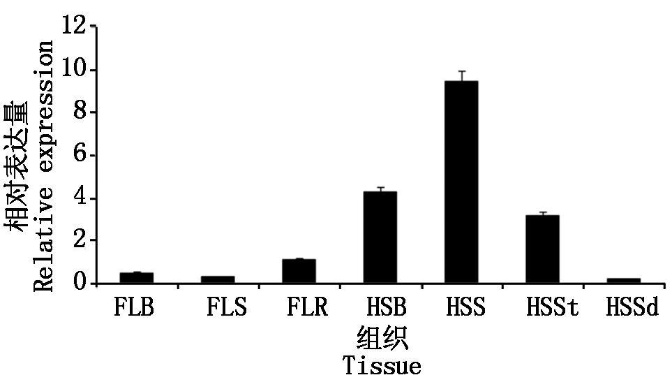 为了分析药用野生稻OoADF1的组织表达特性,以幼苗四叶期叶片、叶鞘和根、抽穗期的叶片、叶鞘、茎和幼穗等7个组织的cDNA为模板进行qRT-PCR扩增,结果表明,OoADF1在四叶期的叶片、叶鞘、根、抽穗期的叶片、叶鞘、茎和幼穗等7个组织中均表达,四叶期根部表达量最高,抽穗期叶鞘表达量最高,随着生长发育,营养器官OoADF1表达水平逐渐变大(图3),OoADF1在各组织中均有表达,不具有表达的组织特异性。