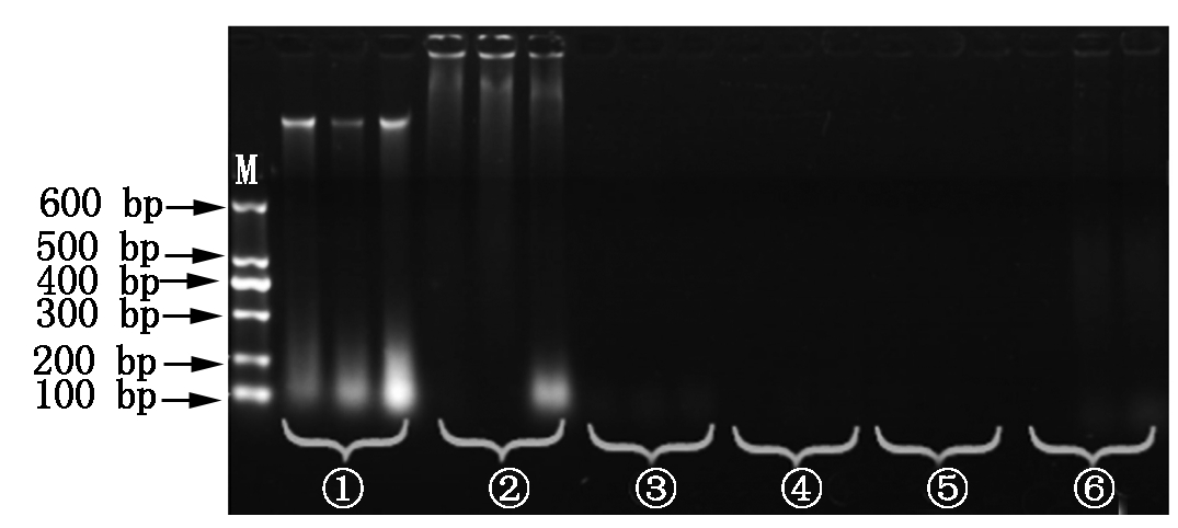 M.DNA MarkerⅠ;①-⑥.DNA from CTAB method,two-step CTAB method,alkaline lysis methodⅠ,alkaline lysis methodⅡ,alkaline lysis method Ⅲ,alkaline lysis method Ⅳ.The same as Fig.2-4.