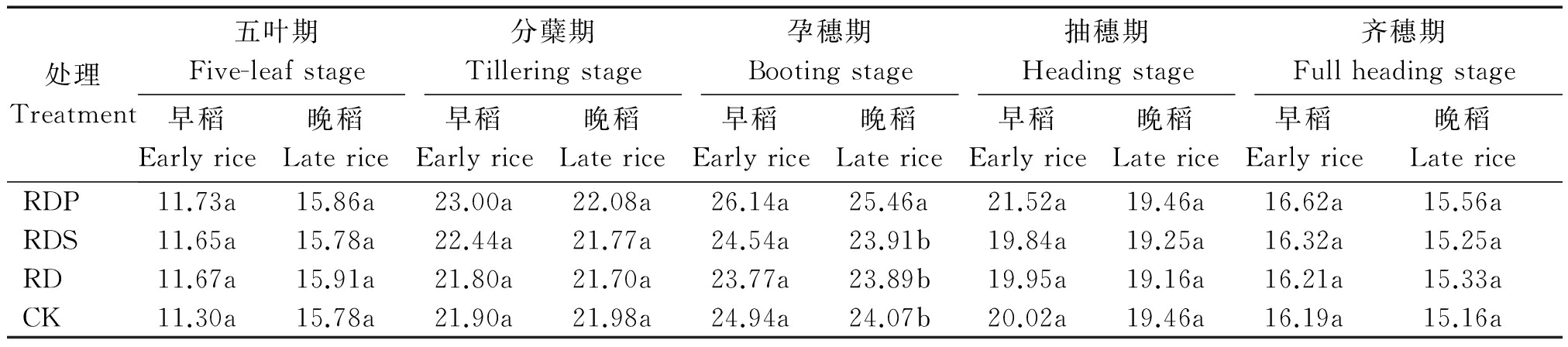 随着水稻生长发育的进行,两季中4个处理植株根系干物质均呈增加趋势,且均在齐穗期达到最大值(表5)。由表5可知,与CK处理相比,两季中RDP处理植株根系干物质整体均呈增加趋势,最大增幅为57.14%,且在早稻分蘖期-齐穗期和晚稻分蘖期达到显著性差异(P<0.05);RDS处理植株根系干物质在两季分蘖期均达到显著性差异(P<0.05),其余时期整体差异不显著(P>0.05)。两季中RD处理植株根系干物质整体相对劣于CK处理,在晚稻孕穗期达到显著性差异(P<0.05),其他时期均未达到显著性差异(P>0.05)。