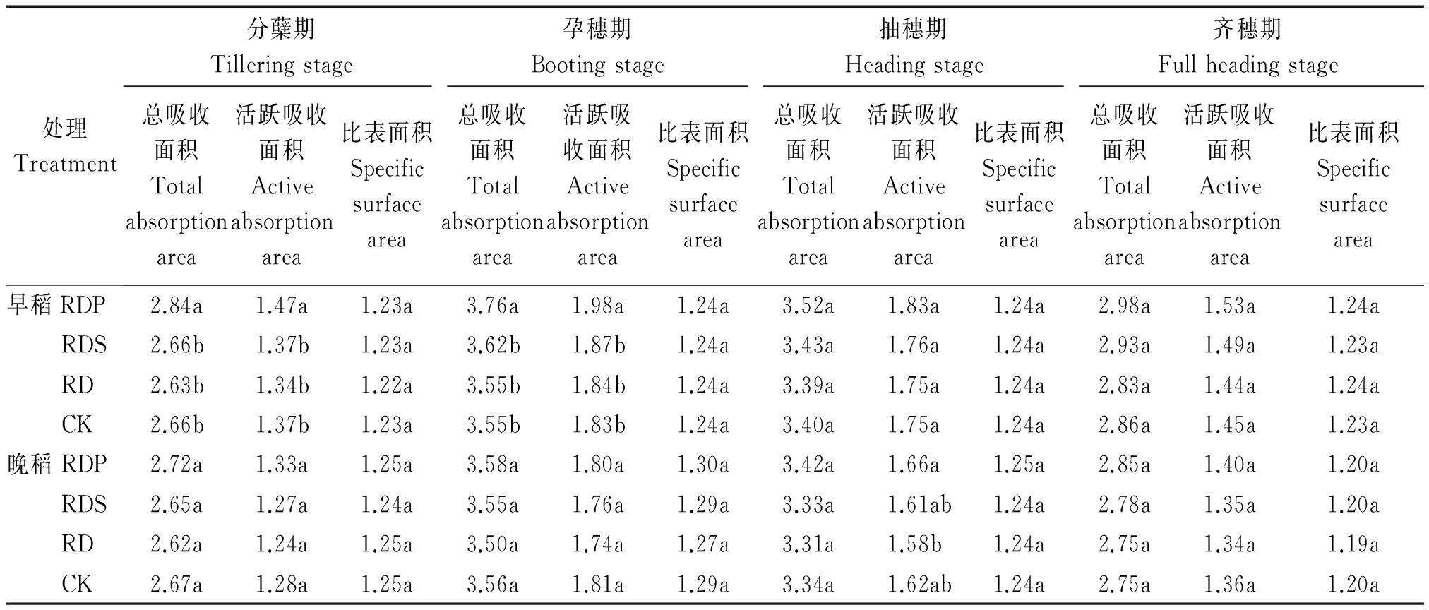 处理Treatment分蘖期Tilleringstage孕穗期Bootingstage抽穗期Headingstage齐穗期Fullheadingstage总吸收面积Totalabsorptionarea活跃吸收面积Activeabsorptionarea比表面积Specificsurfacearea总吸收面积Totalabsorptionarea活跃吸收面积Activeabsorptionarea比表面积Specificsurfacearea总吸收面积Totalabsorptionarea活跃吸收面积Activeabsorptionarea比表面积Specificsurfacearea总吸收面积Totalabsorptionarea活跃吸收面积Activeabsorptionarea比表面积Specificsurfacearea早稻RDP2.84a1.47a1.23a3.76a1.98a1.24a3.52a1.83a1.24a2.98a1.53a1.24a RDS2.66b1.37b1.23a3.62b1.87b1.24a3.43a1.76a1.24a2.93a1.49a1.23a RD2.63b1.34b1.22a3.55b1.84b1.24a3.39a1.75a1.24a2.83a1.44a1.24a CK2.66b1.37b1.23a3.55b1.83b1.24a3.40a1.75a1.24a2.86a1.45a1.23a晚稻RDP2.72a1.33a1.25a3.58a1.80a1.30a3.42a1.66a1.25a2.85a1.40a1.20a RDS2.65a1.27a1.24a3.55a1.76a1.29a3.33a1.61ab1.24a2.78a1.35a1.20a RD2.62a1.24a1.25a3.50a1.74a1.27a3.31a1.58b1.24a2.75a1.34a1.19a CK2.67a1.28a1.25a3.56a1.81a1.29a3.34a1.62ab1.24a2.75a1.36a1.20a