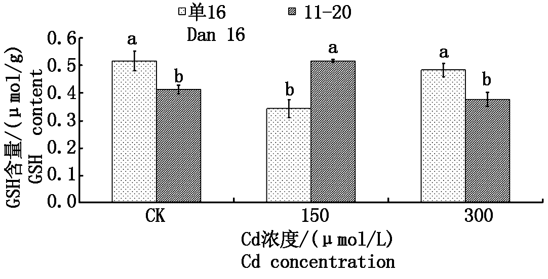 如图4所示,棉苗根中GSH含量(以鲜质量计)均随着镉浓度的增加先升高后下降。棉苗根中谷胱甘肽含量在150 μmol/L镉处理下达到最大,单16和11-20根GSH含量与各自对照相比分别约上升6.61%和11.71%;在300 μmol/L镉处理下GSH含量降低,与对照相比,单16和11-20根GSH含量分别下降了约0.66%和4.81%。