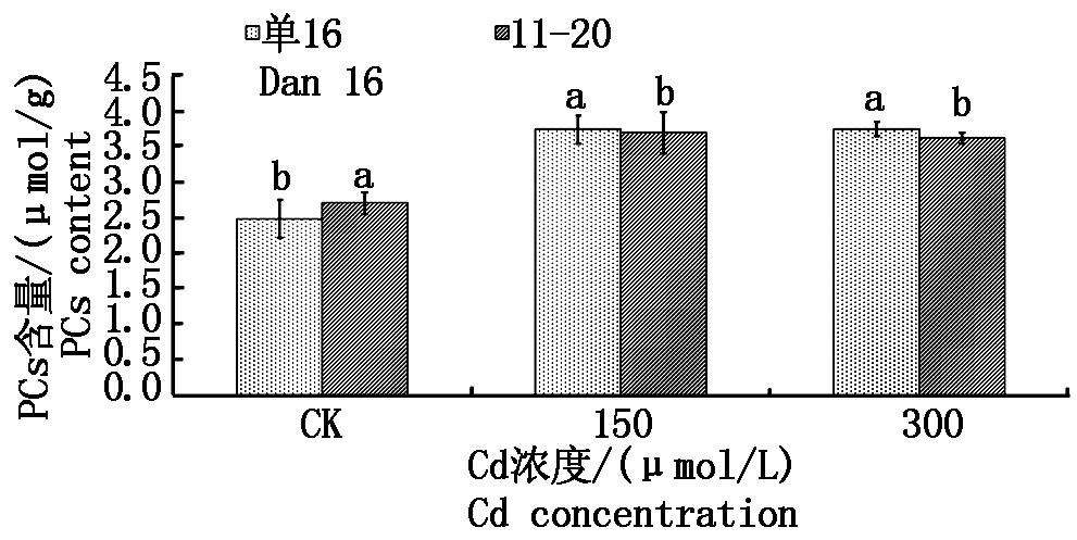 如图8所示,棉苗茎中PCs含量(以鲜质量计)变化同根相似,与对照相比,均随着镉浓度的增加而增加,11-20根中PCs含量显著高于单16。在150 μmol/L镉处理下,与各自对照相比,单16和11-20分别约上升14.95%和39.07%;在300 μmol/L镉处理下,与各自对照相比,单16和11-20分别约上升17.07%和28.49%。