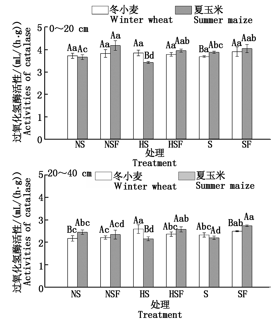 20~40 cm土层冬小麦收获期土壤过氧化氢酶活性变化为HS>SF>HSF>S>NSF>NS,活性最高的HS处理为2.587 mL/(h·g),活性最低的NS处理为2.170 mL/(h·g),差异显著;夏玉米收获期土壤过氧化氢酶活性变化为SF>HSF>NS>NSF>S>HS,活性最高的SF处理为2.737 mL/(h·g),活性最低的HS处理为2.153 mL/(h·g),差异显著,综合比较,SF处理下的土壤过氧化氢酶活性相对比较高,这也说明秸秆还田与施肥在一定程度上会增加冬小麦和夏玉米收获期的土壤过氧化氢酶活性。